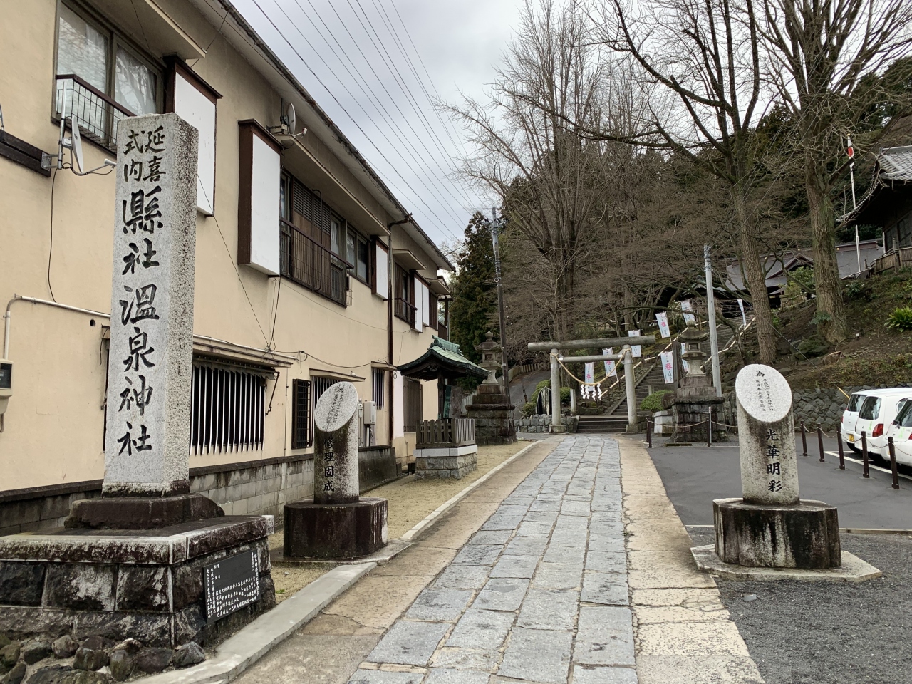 いわき湯本温泉の真ん中にある神社です。社伝によると、湯ノ岳を神体とし湯ノ岳山頂に鎮座していた宮が江戸時代の明和5年(1768値)に現在地へ遷宮されたそうです。本殿は元禄8年(1695年)に内藤家により造営されたもので、市の有形文化財とのこと。小高い丘の上にあり、温泉街の散策にも丁度良い場所です。