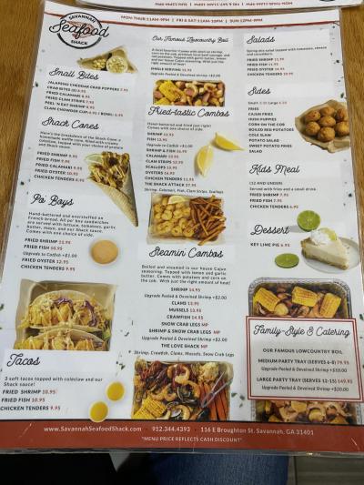 サヴァンナ市街観光の後、イースト・ブロートン通り沿いの「シーフード・シャック」へ。気軽に入れるシーフードレストランです。この店自慢の「ローカントリーボイル」をオーダー、サウスカロライナ海岸の低地の海面地域で獲れるシーフードとソーセージやコーンをボイルしたスパイス香るケイジャン料理。アフリカから来た奴隷たちがもたらした食文化とされています。フライド・カラマリ(イカリングフライ)とフライドポテトをサイドに。イカがちょっと貧相ですが、気軽に入店出来てリーズナブルな価格で美味いシーフードが味わえる店でした。注文もしやすいしおススメです。