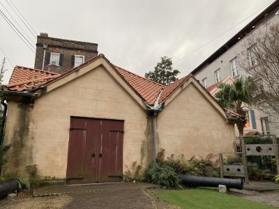 1713年築の旧カロライナ州で現存する最古の公共施設とのこと。アメリカ独立戦争では火薬庫として使用された国定歴史建造物です。約80cmの分厚い漆喰の壁を持ち、爆発が起こった場合は屋根が吹き飛んで屋根の砂が落ちて酸素を遮断し火を消すように造られていたそうです。
