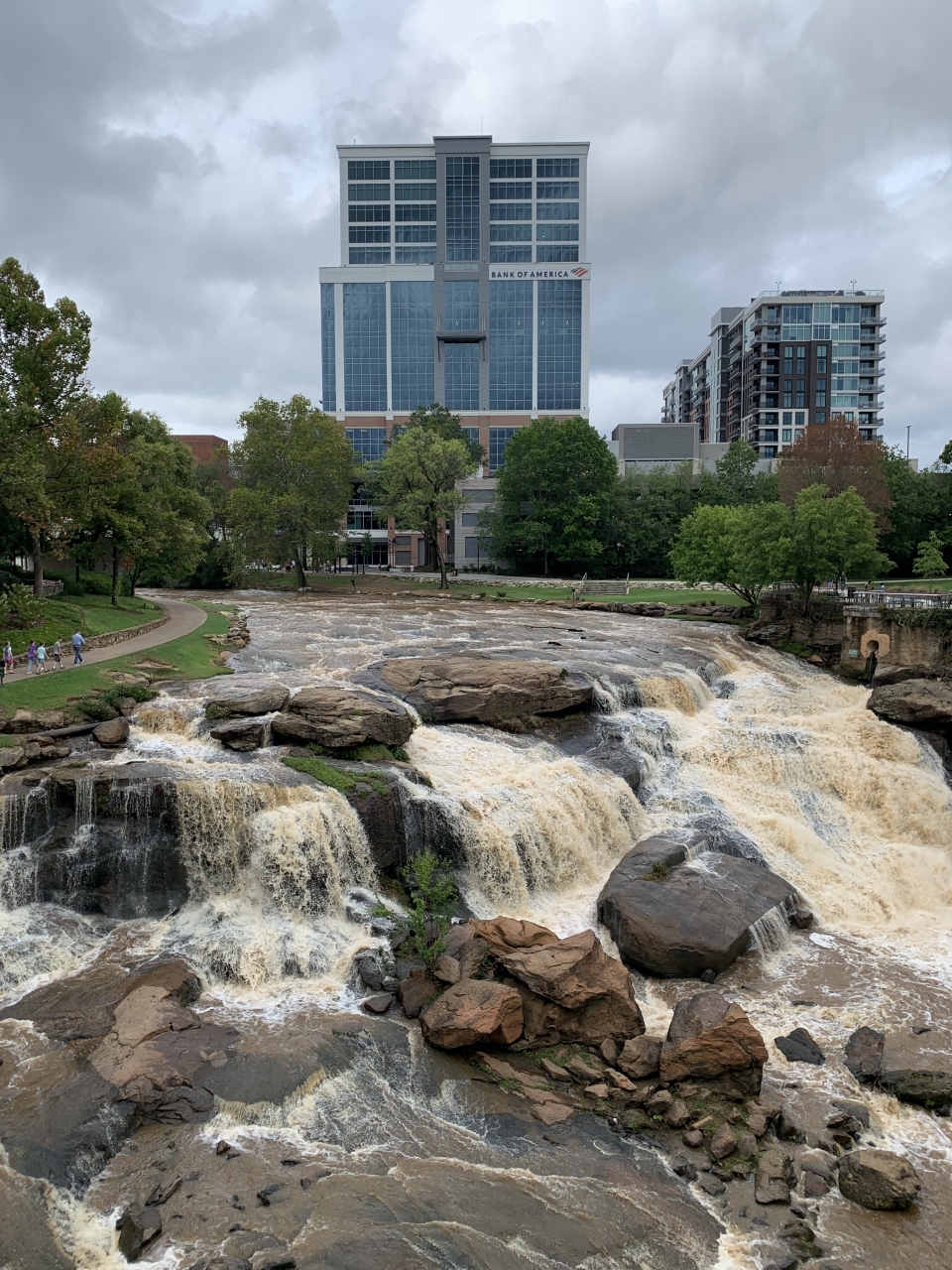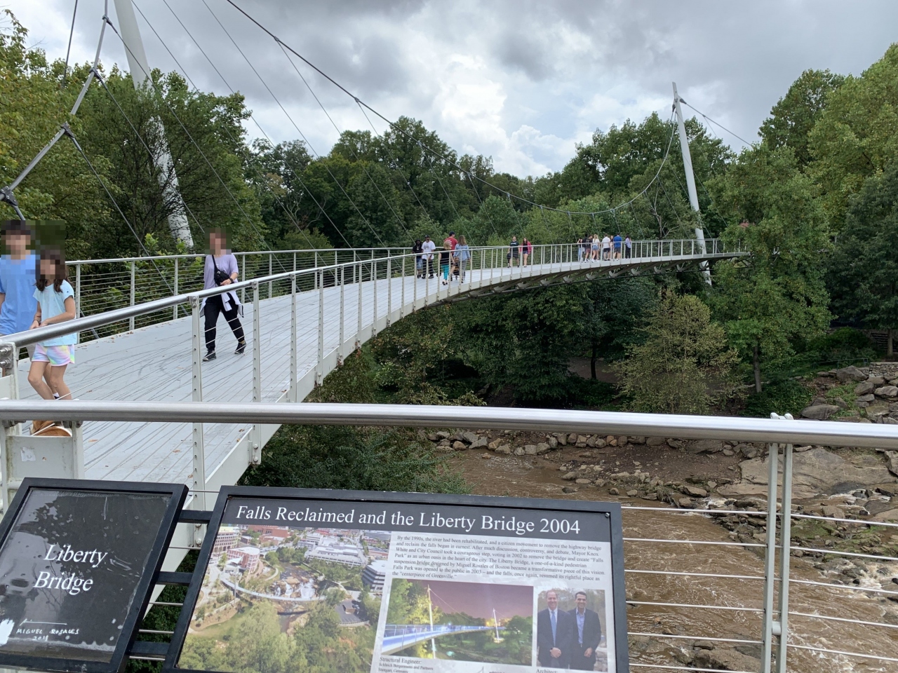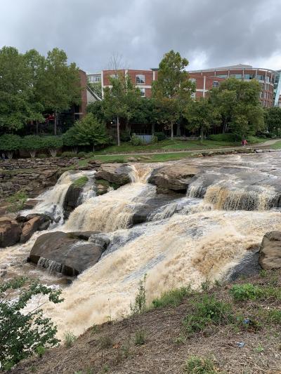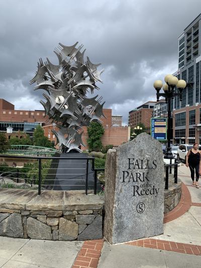 グリーンビルのダウンタウンから南へ半マイルほどのところにある公園です。専用駐車場が無いので、路肩の駐車スペースをなんとか確保(なかなか空きませんでしたが)。その名の通りリーディ川の滝がある公園で、公園内の滝まではほんの少しだけ歩きます。リバティ・ブリッジと名付けられた橋からリーディ川の滝を眺めます。落差はあまりありませんが幅は割と大きな滝で、ビルの合間の滝はちょっと不思議な風景です。洗練された雰囲気の町の中で自然の癒しを感じられる素晴らしい公園です。