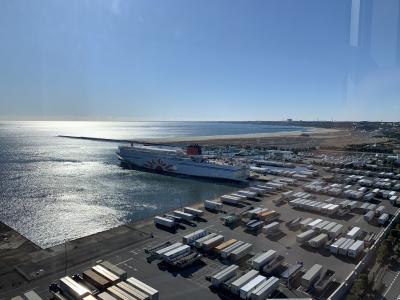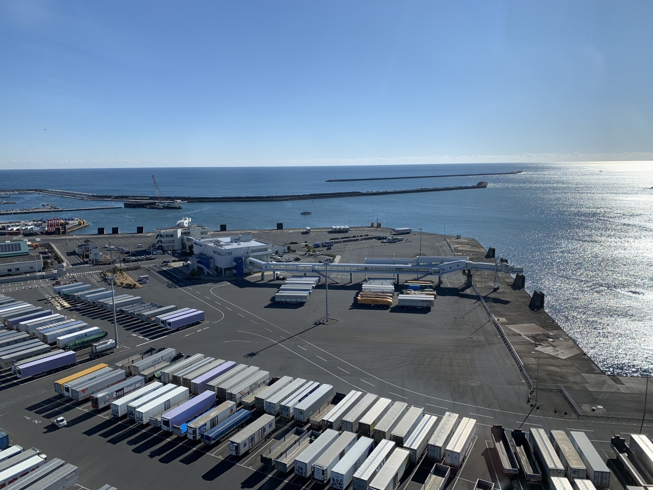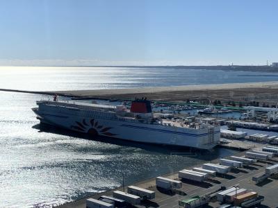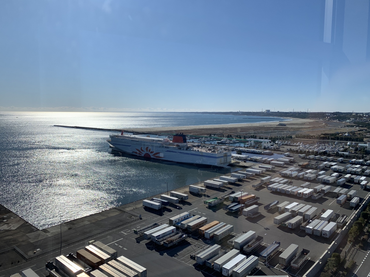 太平洋の水平線の素晴らしい景色と、大洗港に停泊する「さんふらわぁ」