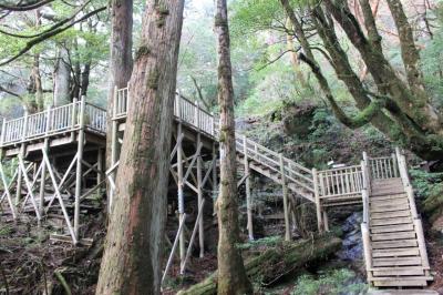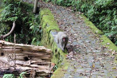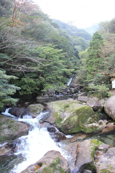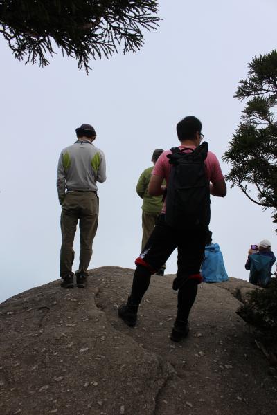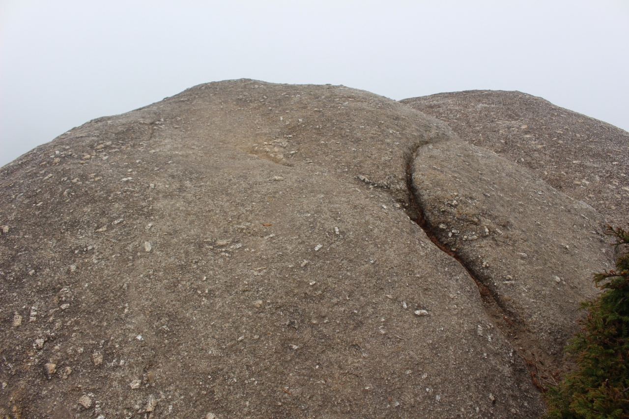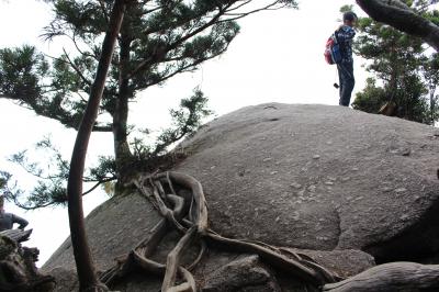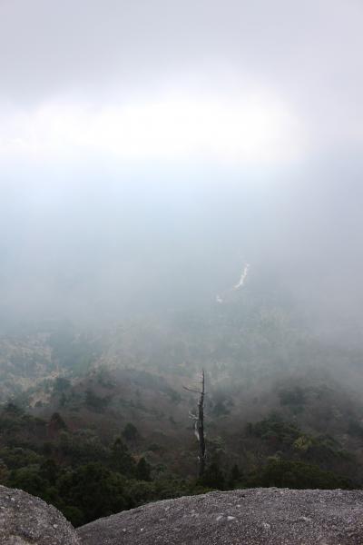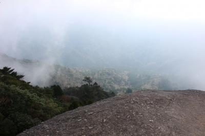 白谷雲水峡の最奥部、標高1050m地点にある花崗岩の巨石です。太鼓岩コースの最後のいちばんキツイ傾斜を登りきると、突然岩肌に到達して目の前が開けます。丸い岩に立てるスペースはそんなに広くないので、数人でいっぱいになります。もちろん柵もないし丸い岩の傾斜のどこまで前へ出るかは自己判断(落ちたら死にます)。太鼓岩に出た時にはちょうど霧が出始めたところで、何とか下界の森と川がうっすらと見えました。後から続々と登山者が来ますので適当なところで譲って、登って来る時とは違う一方通行の下り道で下りていきます。
