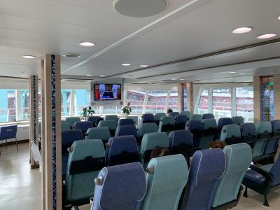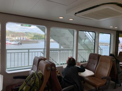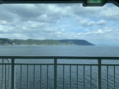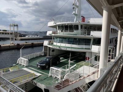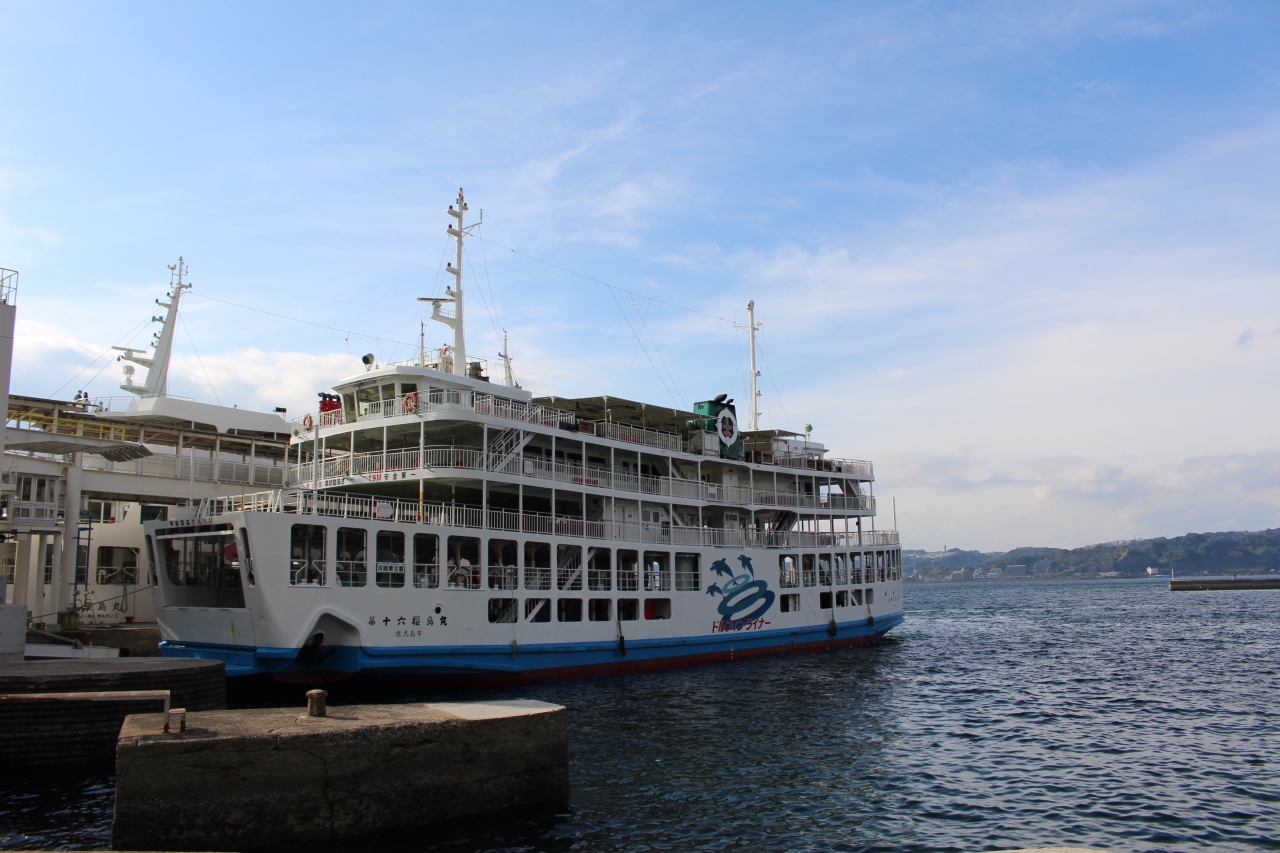鹿児島港桜島フェリーターミナルから乗船、乗ったフェリーは「第十六桜島丸」でした。乗ってすぐに船内のうどん・そば屋「やぶ金」へ。桜島フェリー名物となっているうどんをいただきつつ、窓越しに桜島を見ながら、島まではおよそ15分の船旅でした。