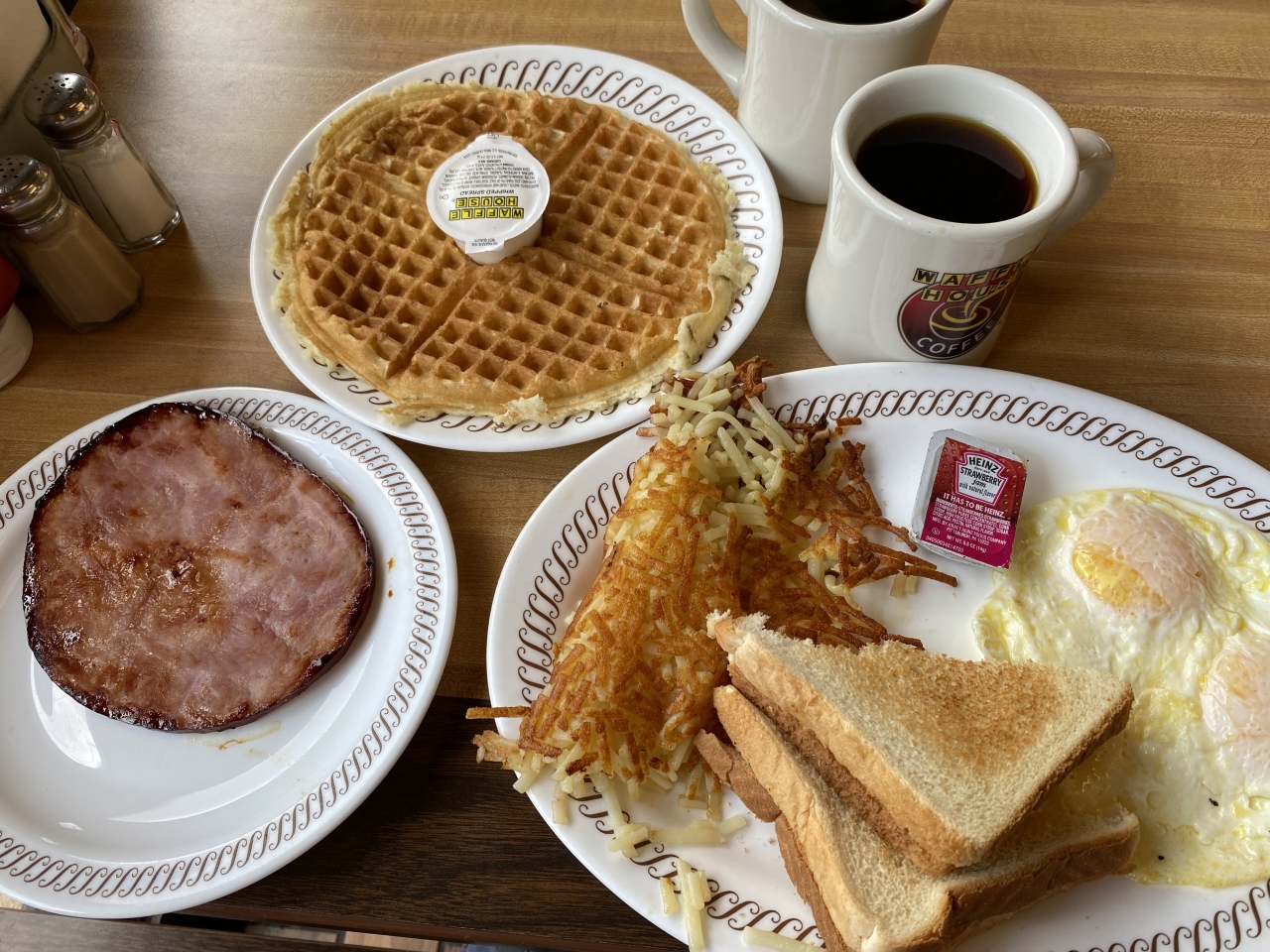 スパルタンバーグのホテルを素泊まりしたので、チェックアウト後に朝食で「ワッフル・ハウス」のスパルタンバーグ店に行きました。ワッフル・ハウスは、アメリカ南部では絶大な勢力を誇るファストフード店で、ちょっとした規模の町には必ずあります。安くてそこそこ美味しいので人気。24時間営業の店も多く、食事どきは結構混んでます。私は大体いつも「オールスター・スペシャル」。但し、これはしっかり空腹の時しかオーダーできません。…というか、しっかり空腹でなければワッフル・ハウスには行きません。妻は大体いつも「フィエスタ・オムレツ」。野菜が入ったオムレツなので比較的ヘルシー。こちらはワッフルは付かないので、オールスターのワッフルを二人でシェアします。とにかく安くて南部の朝食を満喫できる店です。