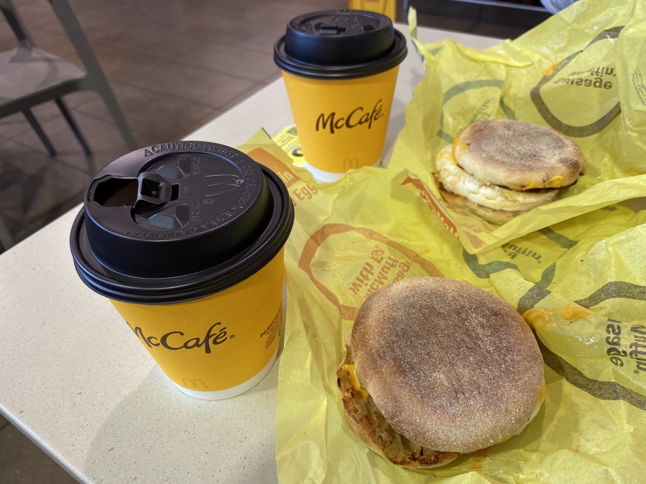 ホテルのすぐ近くにありましたのでブレックファストで利用。私たちにとってマックの朝メニューといえばマックマフィン。私はエッグマックマフィンで、妻はソーセージエッグマフィン、マックカフェと共に。マックはとにかくどこにでもあるし、アプリを使うとお得で便利です。