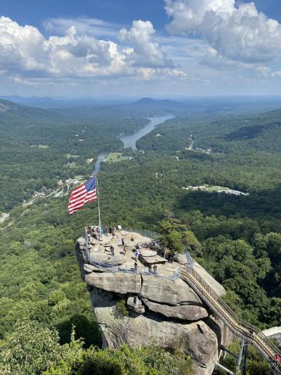 ノースカロライナ州ラザーフォード郡の村にある、高さ約100mの花崗岩の一枚岩です。駐車場まで車で行けば、残りは約500段の階段で絶景に出会えます。さらにもう少し上がると、ロックを含めたルーア湖とブロード川の絶景が待っています。ロックを下りたら終わりではなく、「ヒッコリー・ナット・フォールズ(HICKORY NUT FALLS)」という滝も見どころです。チムニー・ロック周辺は、1992年のアメリカ映画「ラスト・オブ・モヒカン」のロケ地にもなり、この滝の近くの崖がクライマックスの戦いのシーンで使われました。チムニー・ロックの麓はちょっとした観光村みたいになってますので、前後で村を楽しむのもありです。