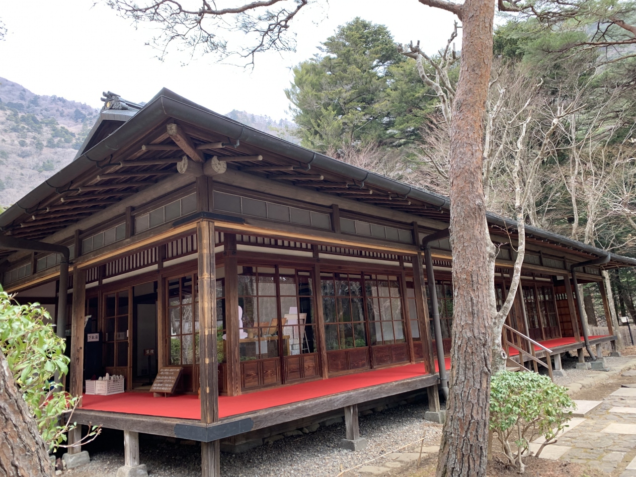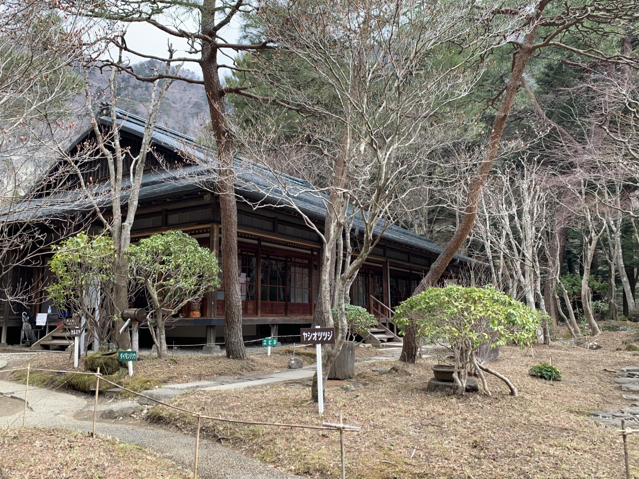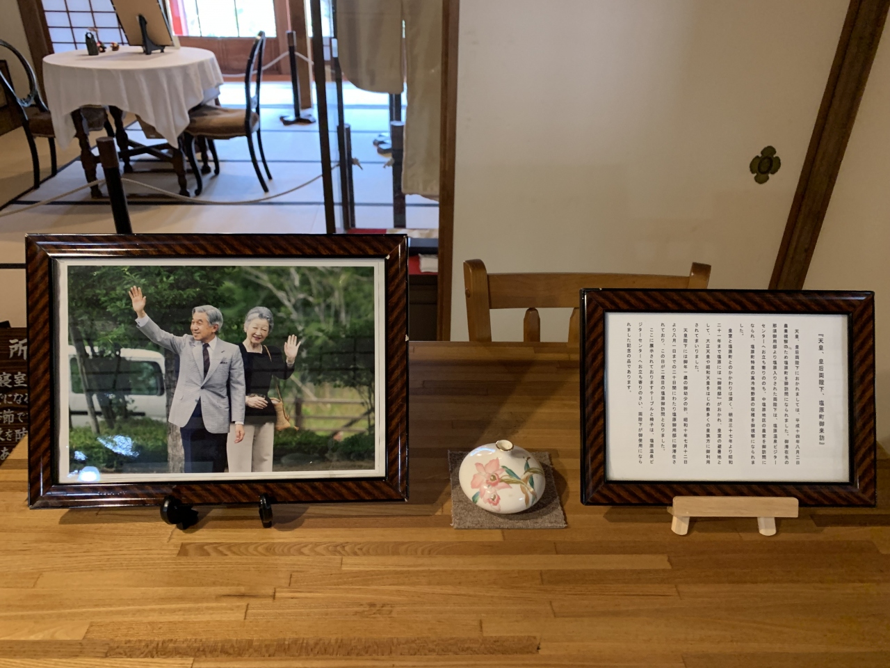 皇族が避暑で訪れた塩原御用邸にあった天皇の間が、昭和56年(1981年)に現在の場所に原型のまま福渡地区から移築保存されたものだそうです。天皇をはじめとする皇族の別荘にしてはこじんまりとして質素な感じがしましたが、塩原で明治から昭和の初めということであれば温泉地内でいちばん豪華な旅館並ですね。純和風で、小規模ながら貴重な明治建築の日本家屋とのこと。建物内には天皇家ゆかりの資料が色々と展示されていました。