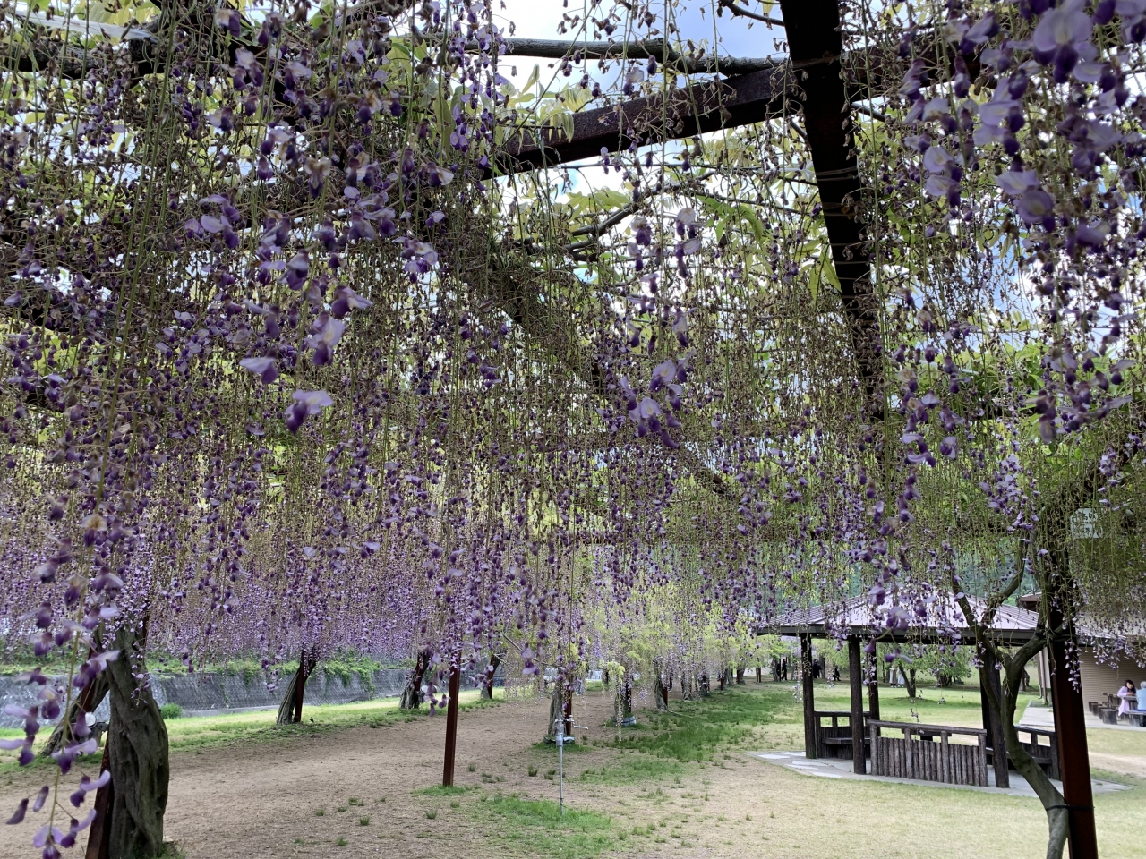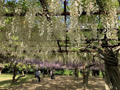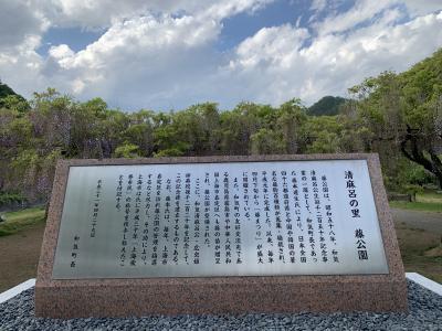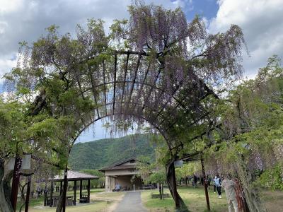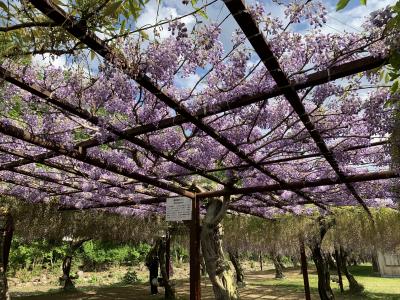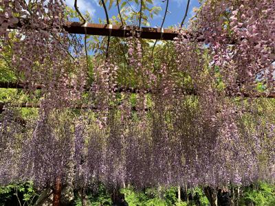 毎年、4月下旬~5月上旬にかけて「藤まつり」が開催されます。2022年のまつり開催最終日の午後に訪れました。GWのピーク時にはかなり渋滞するそうですが、藤は散りはじめで最終日の午後ちょっと遅めということもあり駐車場はガラガラでした。藤公園は和気出身の奈良~平安時代の貴族だった和気清麻呂の生誕1250年を記念し、昭和58年(1983年)に造られた公園とのことです。総延長は500mほどにもなる藤棚には全国から集められた約100種類(その多さは日本一なのだだそう)だけに、こんなに種類があるのかと実際に見て驚きました。