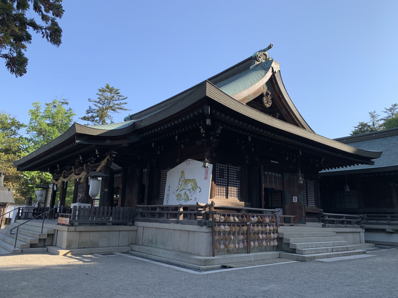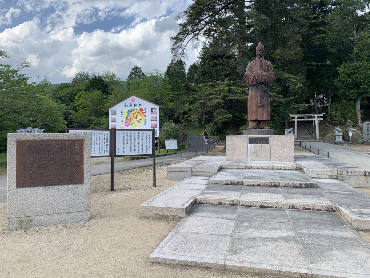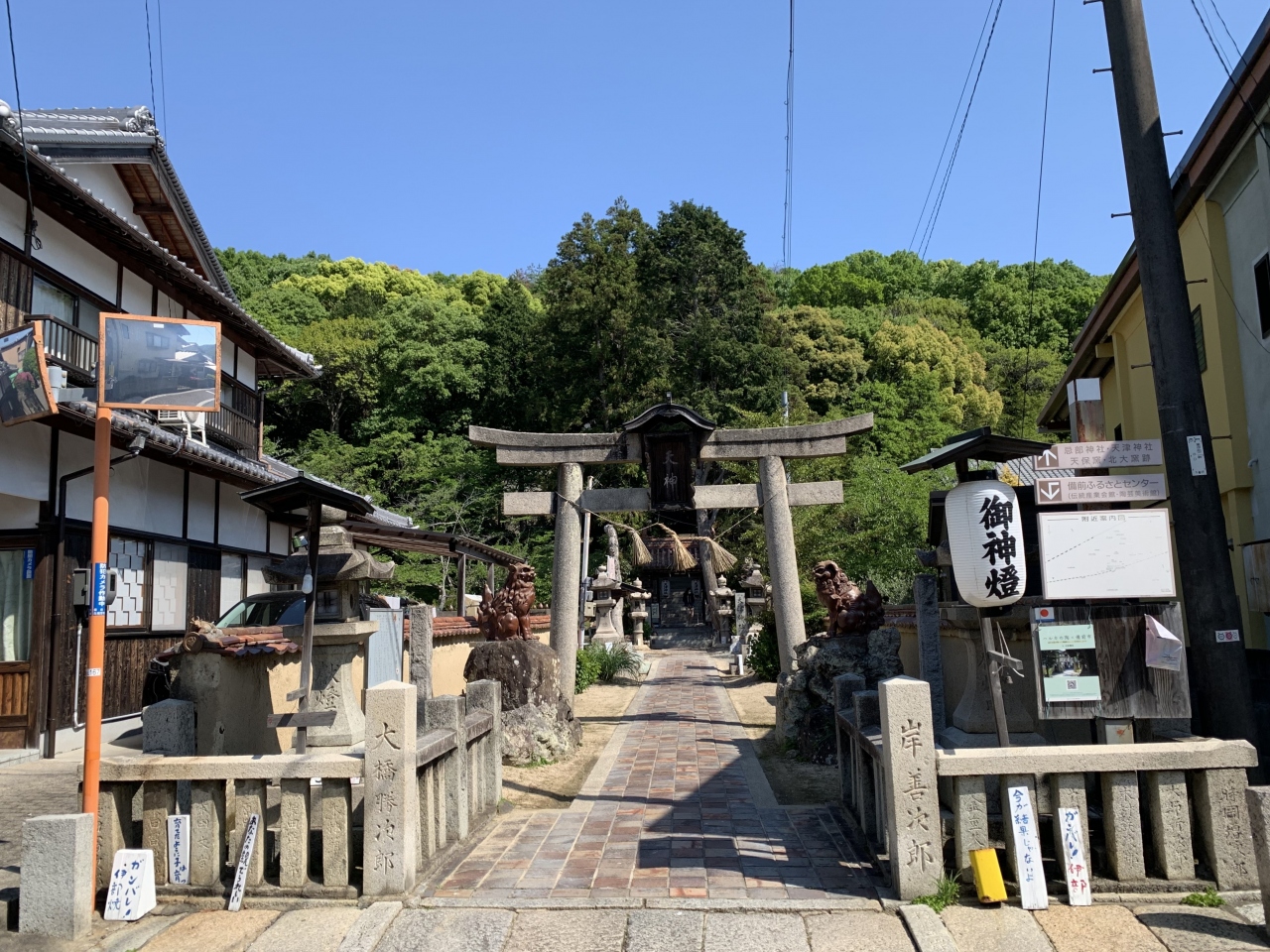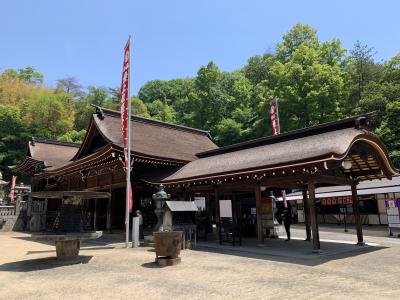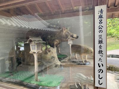 地元の豪族和気氏の氏神だった神社です。鳥居や拝殿前に左右を固めるのは狛犬ではなく狛亥(イノシシ)です。これは、祀られている神である和気清麻呂が足を怪我したときにイノシシが助けたという伝説によるらしいです。現存の拝殿は明治の建物で町指定文化財、本殿は町指定重要文化財、関西一の大棟梁だった宮大工田淵勝義の手によるというそれら建造物は、実際に見ると和風建築の質実剛健な美しさを感じました。隣には西日本屈指の藤の名所で知られる藤公園があります。