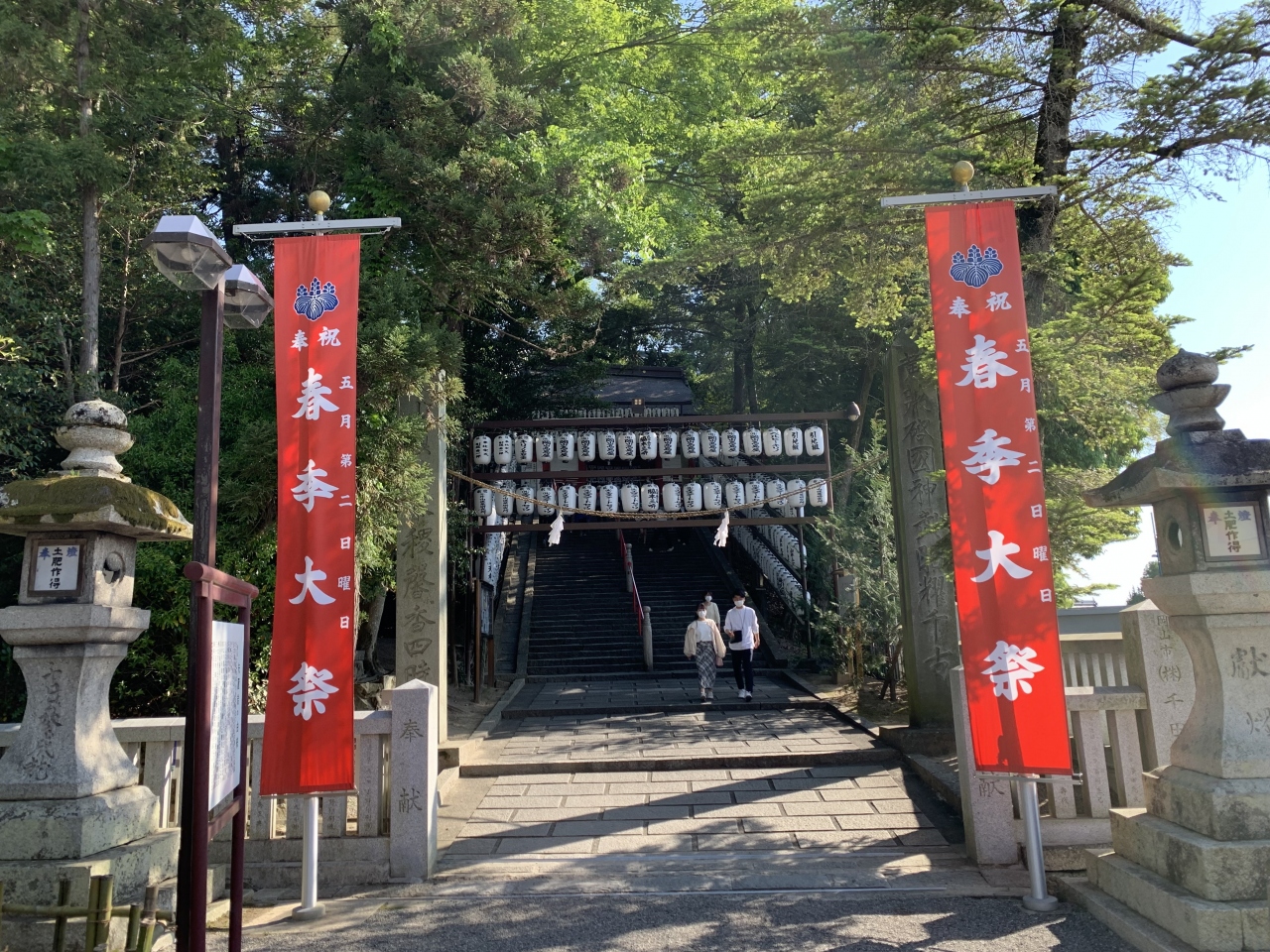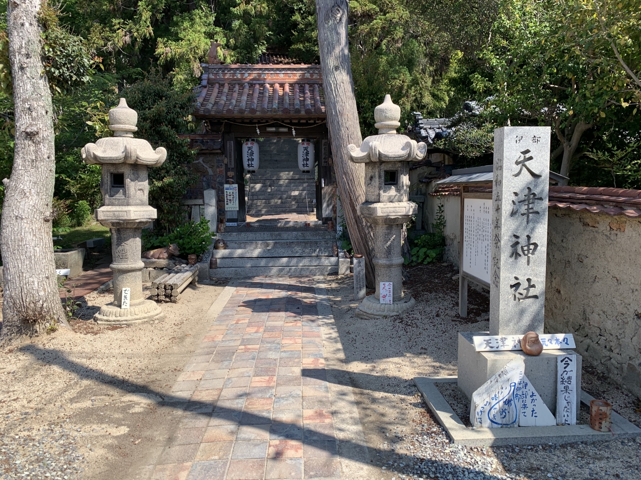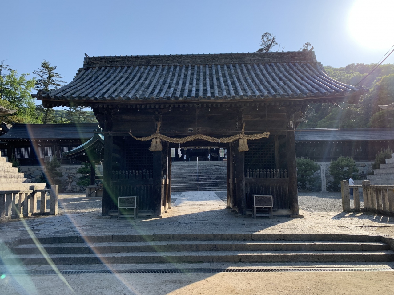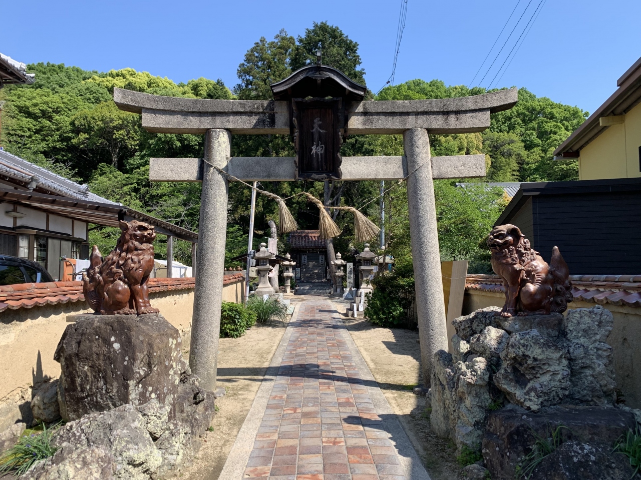 地元の豪族和気氏の氏神だった神社です。鳥居や拝殿前に左右を固めるのは狛犬ではなく狛亥(イノシシ)です。これは、祀られている神である和気清麻呂が足を怪我したときにイノシシが助けたという伝説によるらしいです。現存の拝殿は明治の建物で町指定文化財、本殿は町指定重要文化財、関西一の大棟梁だった宮大工田淵勝義の手によるというそれら建造物は、実際に見ると和風建築の質実剛健な美しさを感じました。隣には西日本屈指の藤の名所で知られる藤公園があります。