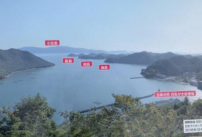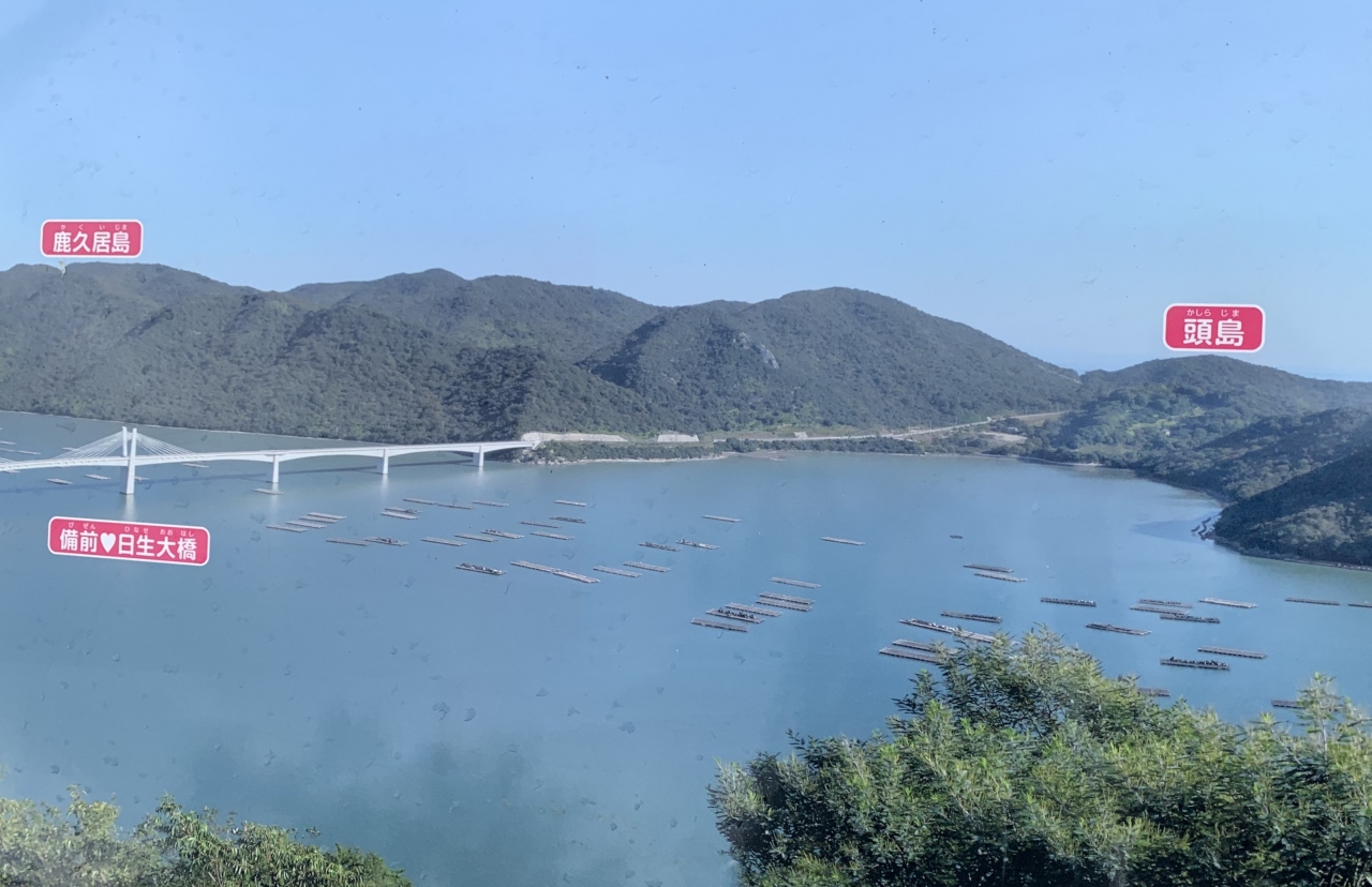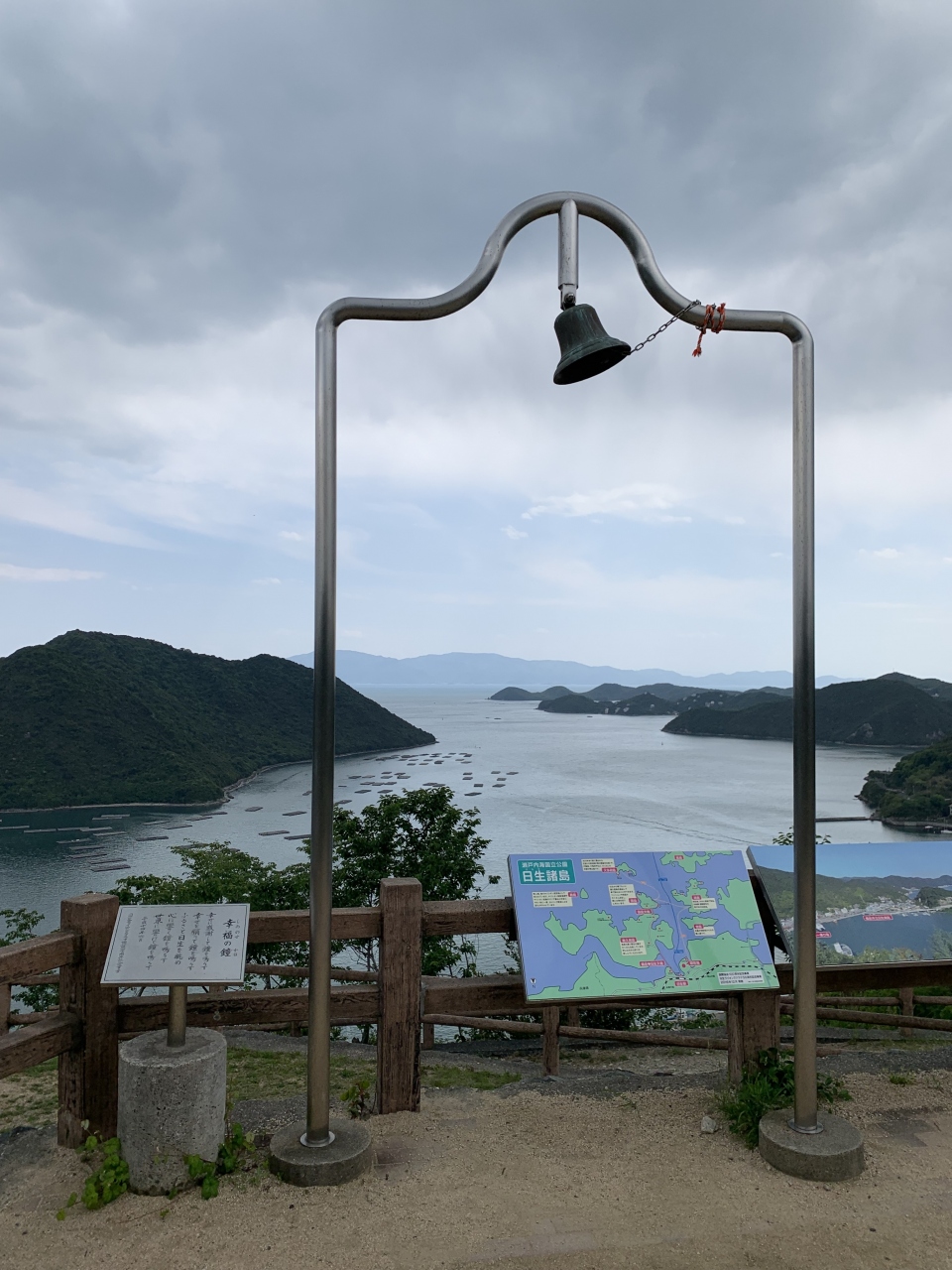 楯越山頂上付近に展望広場・遊歩道・駐車広場を整備した公園です。港を離れて陸側から楯越山の上を狭い道路を通って目指す感じです。小さいながら駐車場有り。駐車場から少し歩いた展望広場からは日生港をはじめ日生エリア一帯が一望できます。公園内にある「幸福の鐘」は、船で使われていた「号鐘」です。標高はそんなにないですが、牡蠣筏が浮かぶ瀬戸内の海と日生諸島の景観は素晴らしいです。
