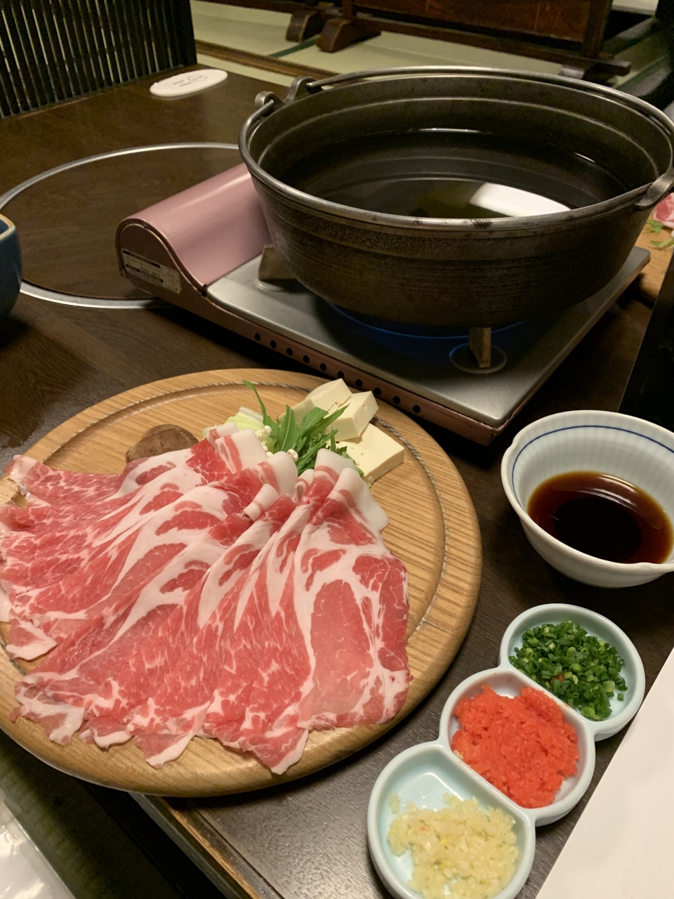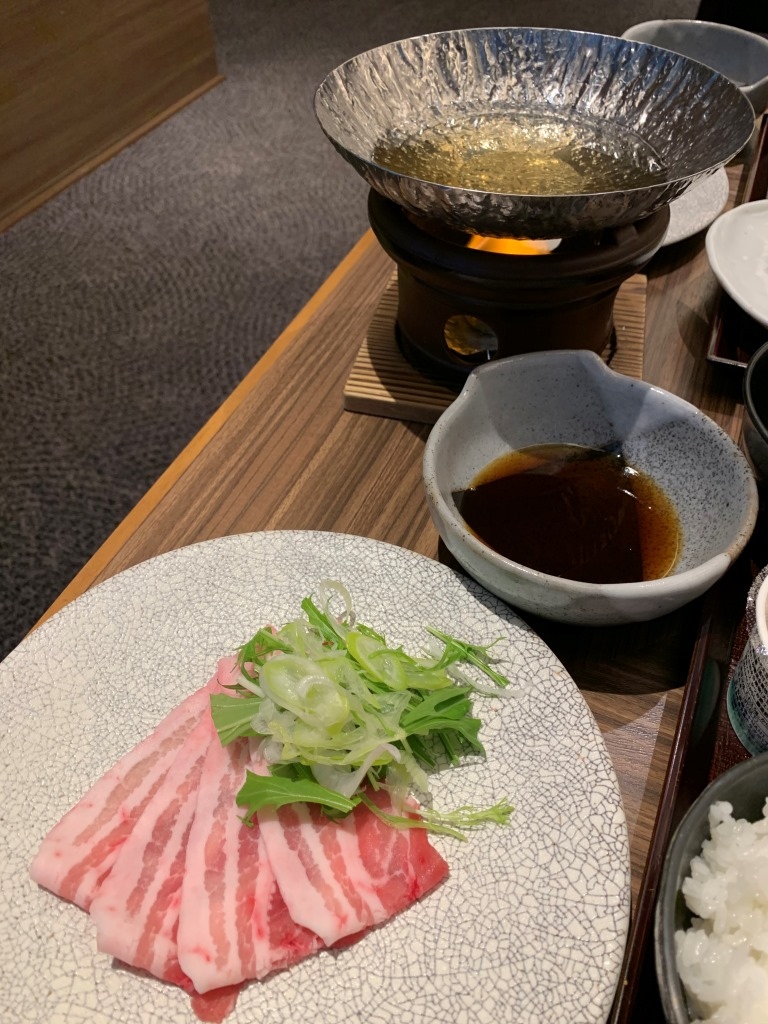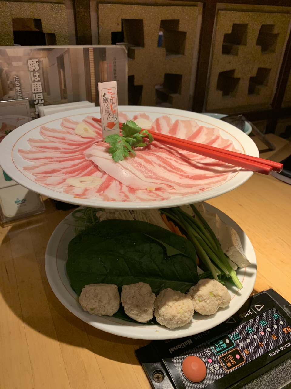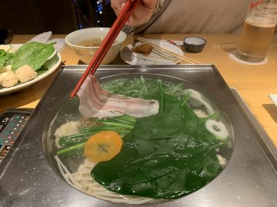 天文館にある”そばつゆ仕立ての黒豚しゃぶ”の店です。人気店ですので予約しておきました。さつま揚げ3種盛り、黒豚串カツ皿、そして黒豚しゃぶ基本のコース”いちの味”をオーダー。この、”こだわりのそばつゆ(おかわり自由)”に浸して食べる黒豚しゃぶは最高です。これには嵌りました!関東へ帰ってもつゆ仕立ての店を探して行くほどに。白ネギも柚子胡椒もおかわり自由。ネギ好きの私にはパラダイスでした。そしてもちろん、しゃぶしゃぶして野菜にくるんでつゆに浸して食べる黒豚が美味い!最後は蕎麦で締めて、大満足の夕食でした。