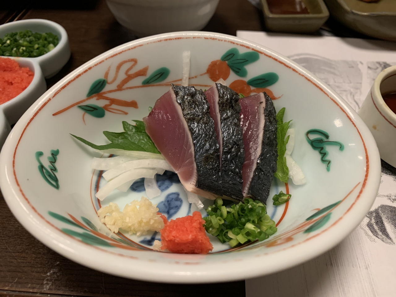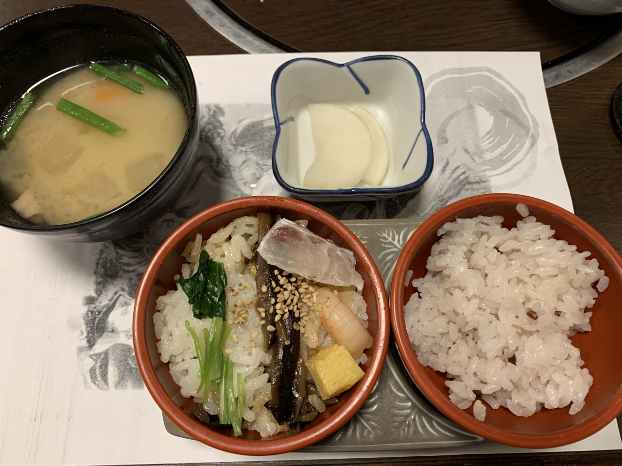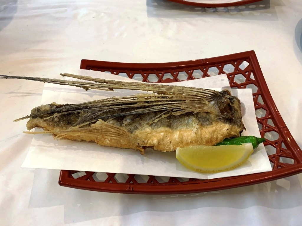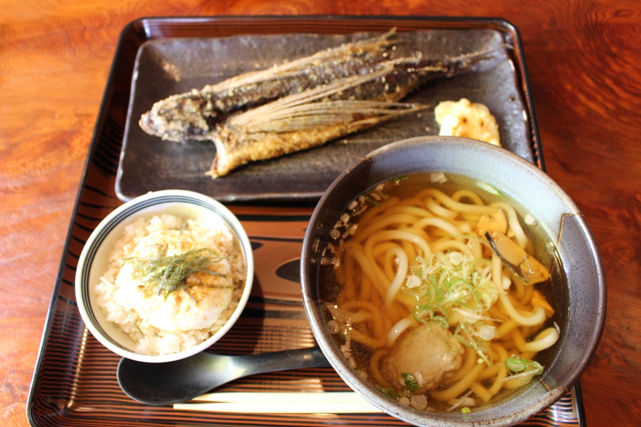 安房港に近い郷土料理の店です。今や貴重なものとなった屋久杉の巨大な工芸品が出迎えてくれます。注文したのは”屋久どん満喫セット”、屋久島名物の「飛魚の姿揚げ」に「屋久島うどん」そして「とろろごはん」が付いたセットです。塩をまぶした飛魚は一晩寝かせて二度揚げされ、外はカリッとして白身が美味い...その「飛唐(とびから)」に豪快に食らいついていただきました。屋久島うどんは鯖節で出汁がとられていてこれまた美味かったです。安房で郷土料理ならココでしょう。