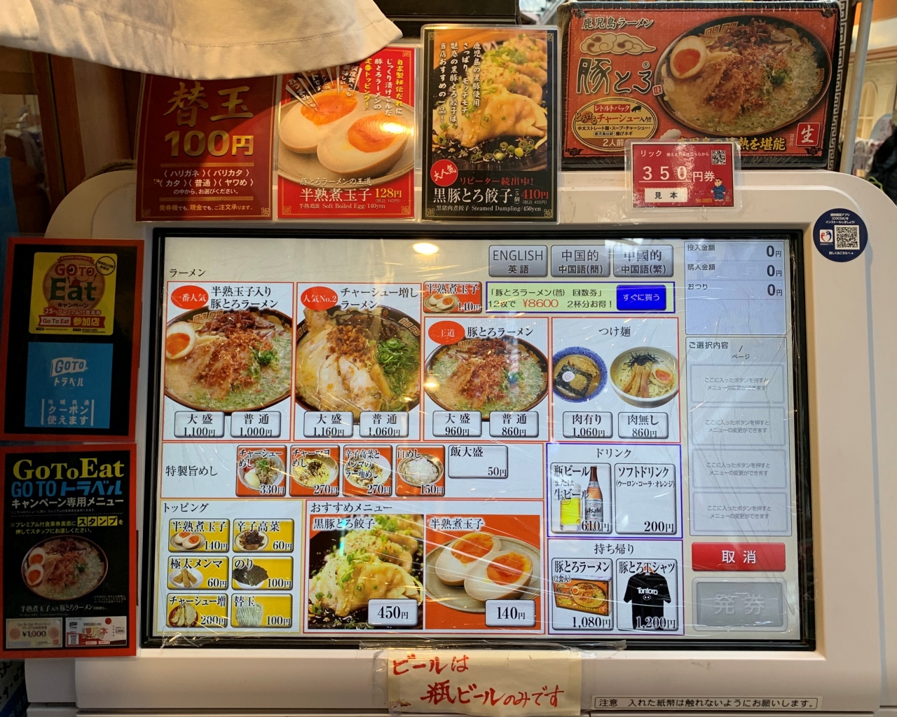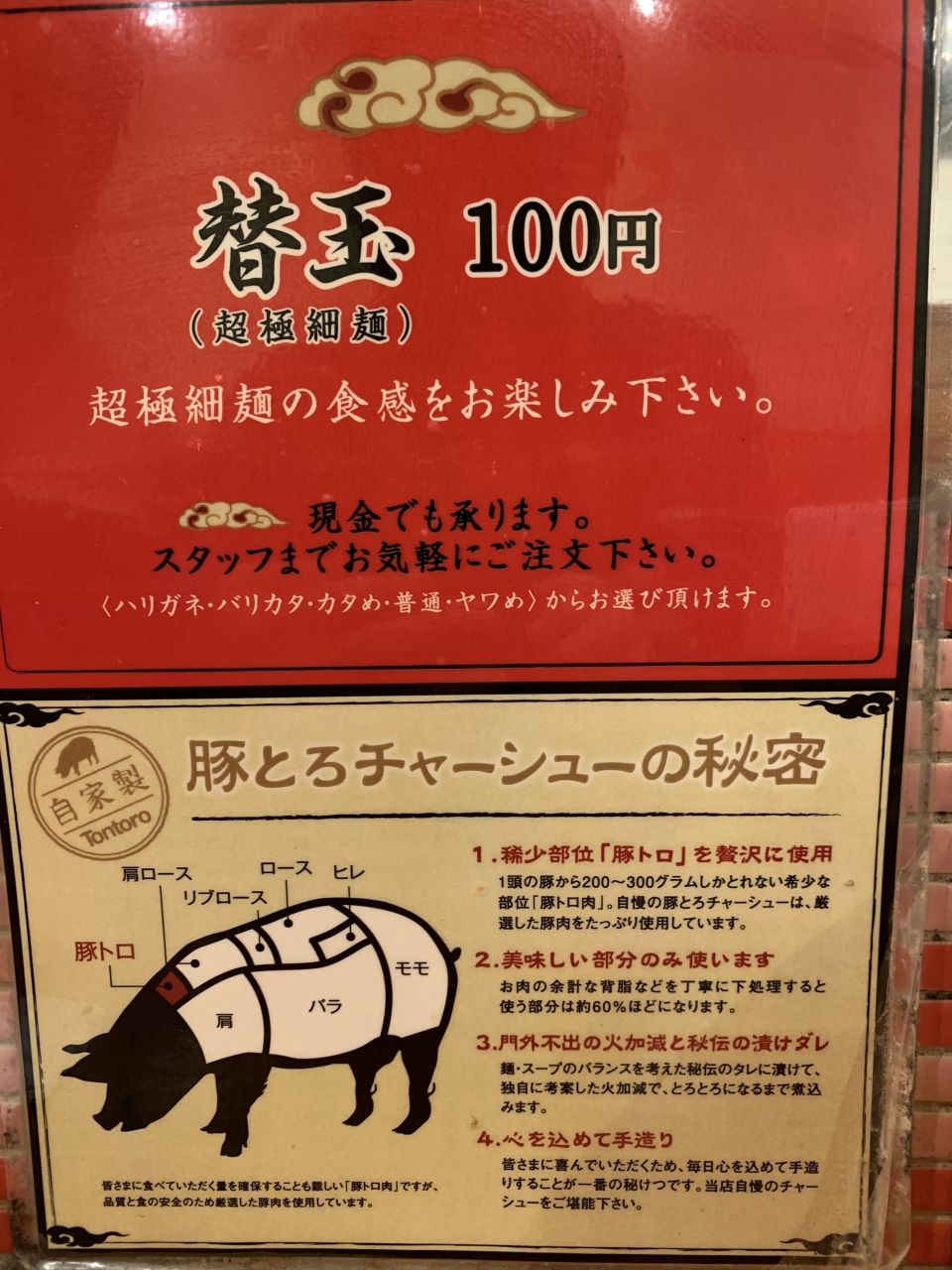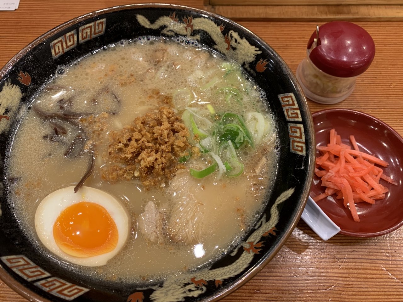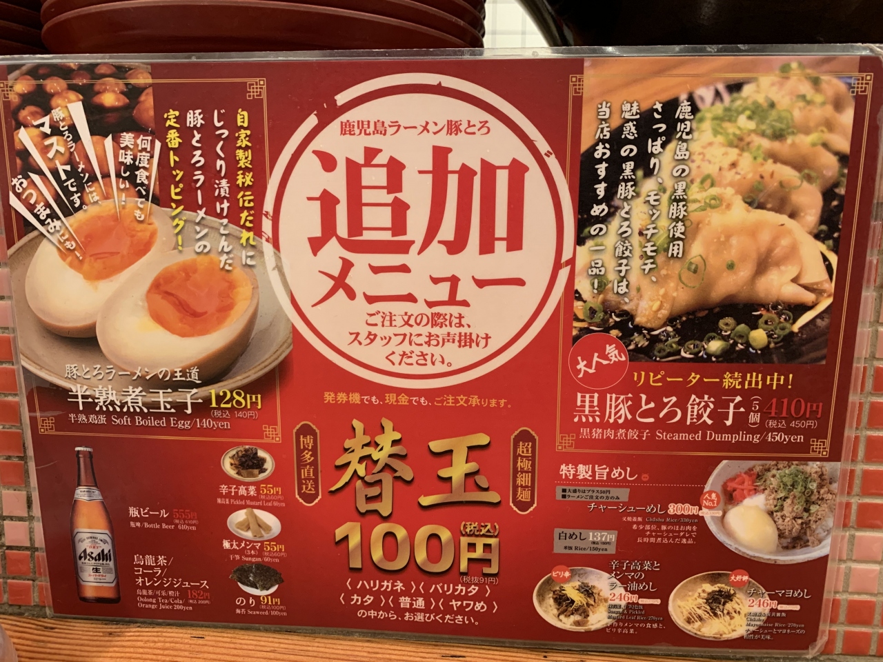 天文館アーケード店は、天文館通りの傍にありますが本店ではありませんので注意が必要です(本店から50mほど)。トロトロの”豚とろチャーシュー”が自慢の人気ラーメン店です。”半熟卵入り豚とろラーメン”をチョイスしました。九州ラーメンに見られる豚骨ベースのストレート麺ですが、福岡に代表されるいわゆる博多豚骨とは少し違いますね。これといった強いインパクトやクセはありませんが普通に美味いです。”黒豚とろ餃子”も追加。後日に某口コミサイトを見ると、近くにある本店の方がかなり評価が高いですね。そちらにしておけばよかったかも。