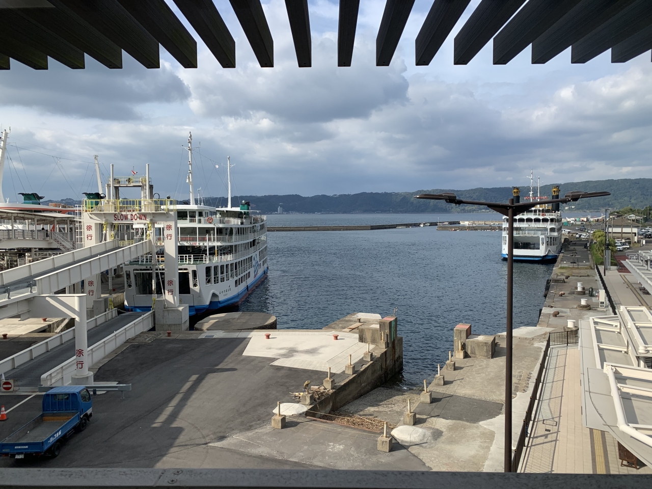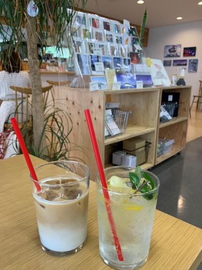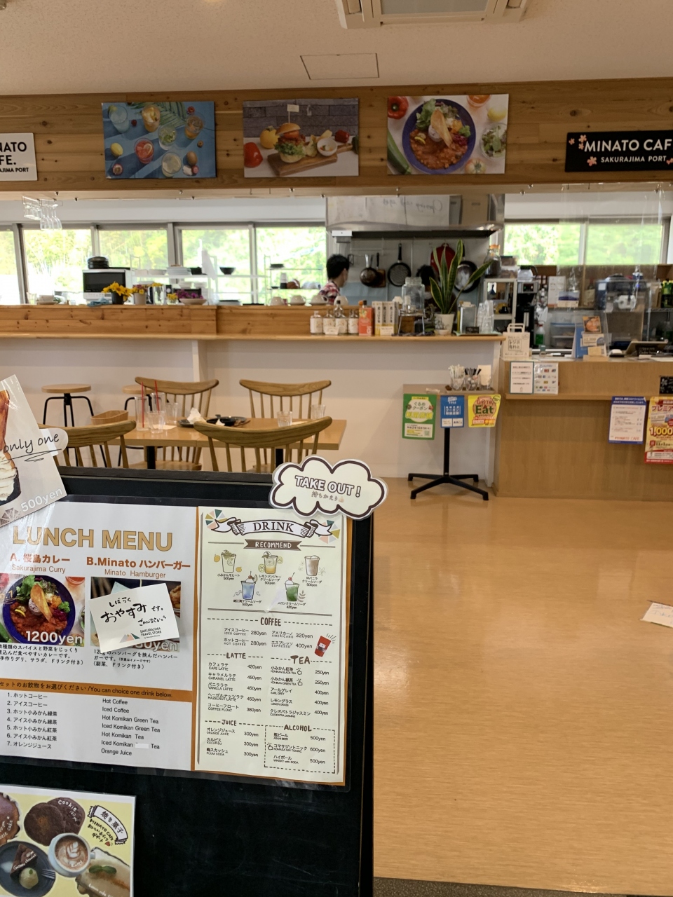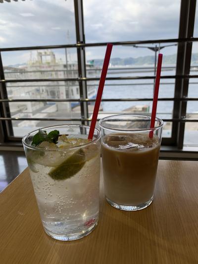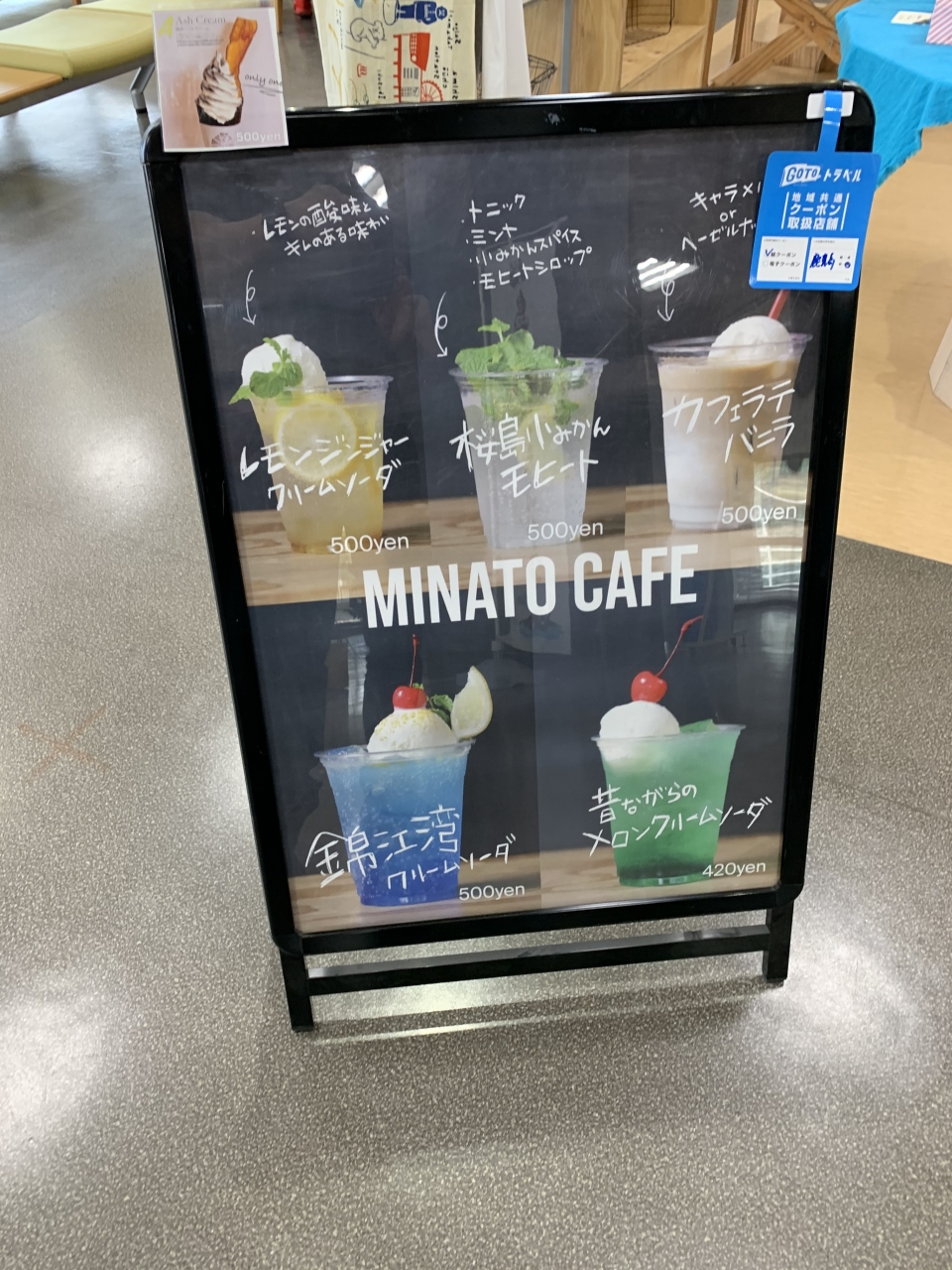 桜島フェリーターミナル内にあります。観光バスの待ち時間で利用しました。桜島小みかんモヒート(ノンアルのトニックジュースとのこと。モヒートはやっぱりテキーラベースであってほしいところですが...)とカフェラテを注文、港を眺めながら休憩できました。桜島カレーなどランチメニューもあります。隣接してお土産屋さんと待合エリアもあり。