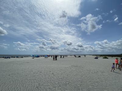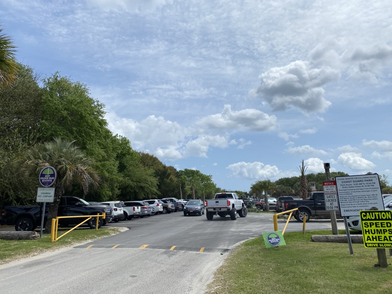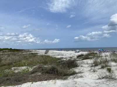 「イーストビーチ」は、セントシモンズ島のオーシャンサイドに沿ったビーチです。第二次世界大戦のホームフロント博物館があるビーチの北端の駐車場からアプローチしました。駐車場は混雑し多くの海水浴やアウトドアの観光客で賑わってました。潮の満ち引きによる固い砂のため自転車に乗ることもできます。