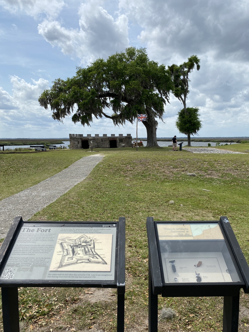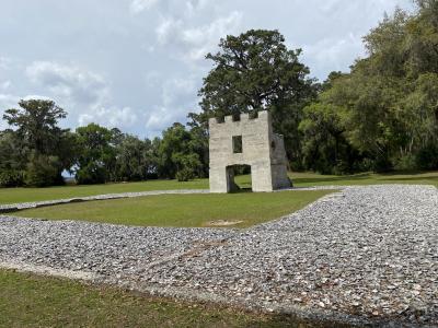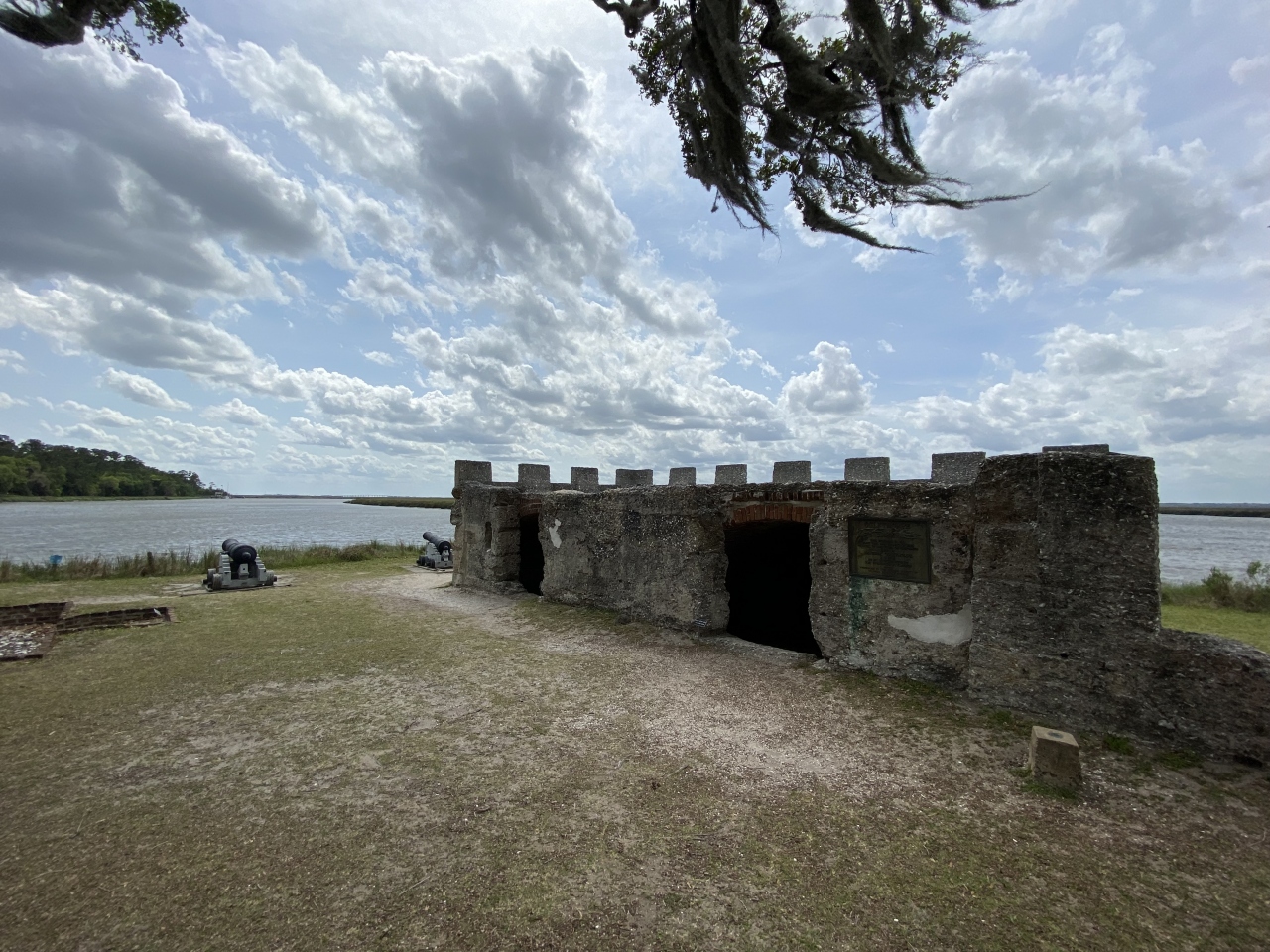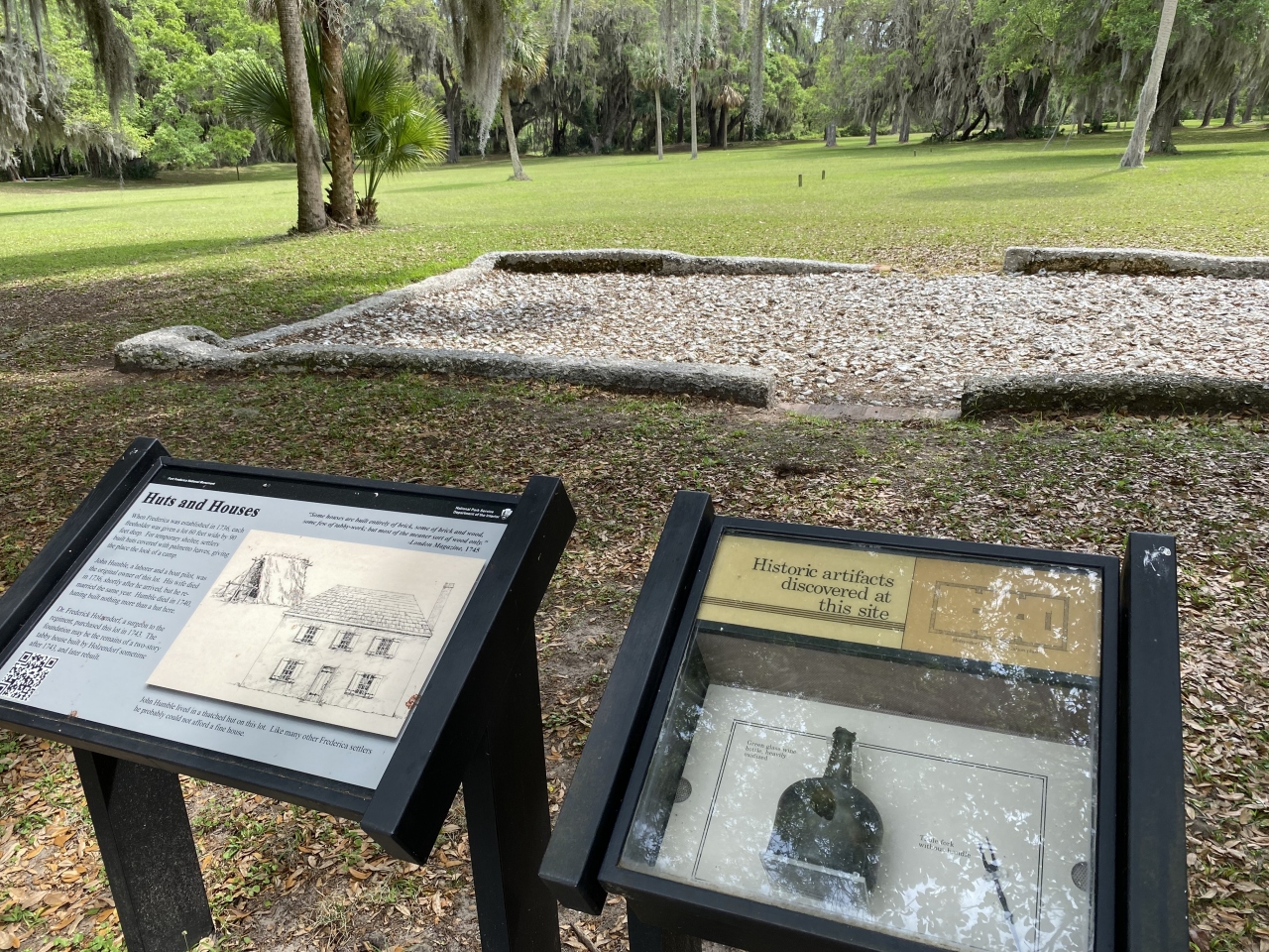 国定史跡の「フレデリカ砦(Fort Frederica)」を訪れました。入場は無料でした。ビジターセンターがあり、砦について学べるとともに、その城下町から出土したと思われる遺物が展示されています。砦の星形要塞の土塁はかすかに痕跡が遺る程度で、「キングス・マガジン」と呼ばれる1740年頃に建てられた火薬庫、監視台、兵士の部屋が遺されています。また、「バラック」では、1742年にスペイン軍がセントシモンズ島に侵攻した際に約200人のイギリス軍が駐屯しており、下級の100人ほどの兵士は板張りや茅葺き屋根の小屋でここでキャンプスタイルで暮らしていたらしい。そんな、欧州各国が植民地を奪い合っていた時代のアメリカを知ることができます。
