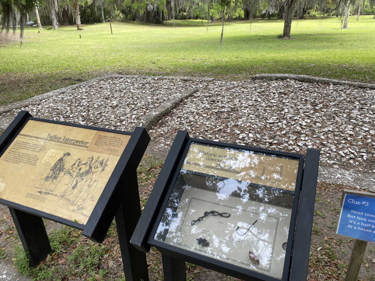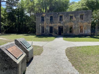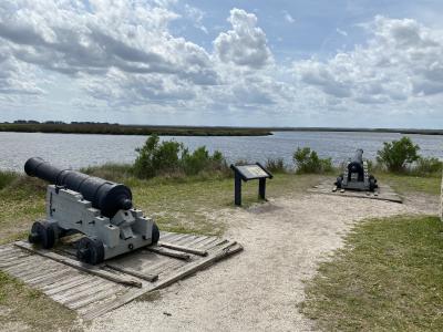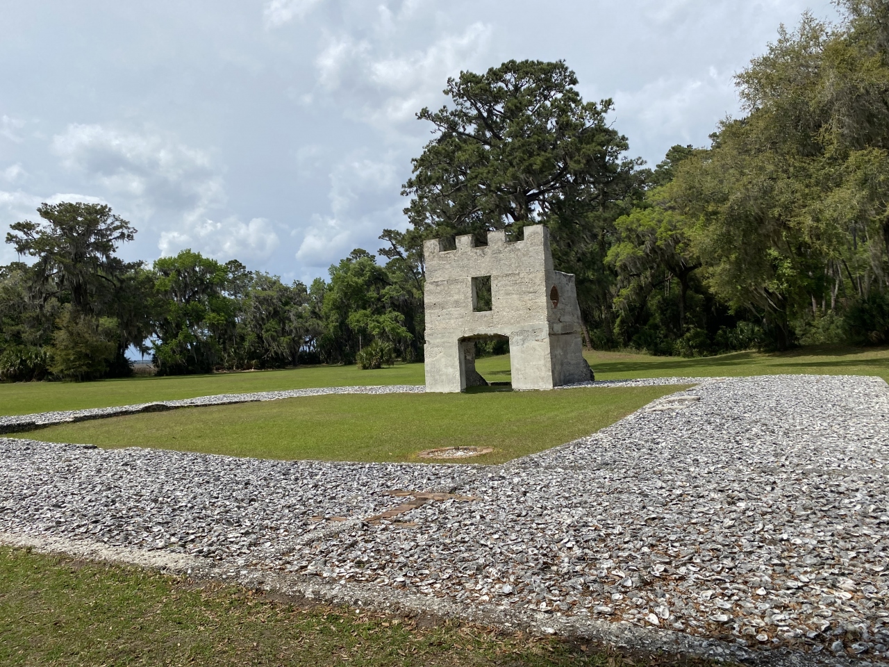 国定史跡の「フレデリカ砦(Fort Frederica)」を訪れました。入場は無料でした。ビジターセンターがあり、砦について学べるとともに、その城下町から出土したと思われる遺物が展示されています。砦の星形要塞の土塁はかすかに痕跡が遺る程度で、「キングス・マガジン」と呼ばれる1740年頃に建てられた火薬庫、監視台、兵士の部屋が遺されています。また、「バラック」では、1742年にスペイン軍がセントシモンズ島に侵攻した際に約200人のイギリス軍が駐屯しており、下級の100人ほどの兵士は板張りや茅葺き屋根の小屋でここでキャンプスタイルで暮らしていたらしい。そんな、欧州各国が植民地を奪い合っていた時代のアメリカを知ることができます。