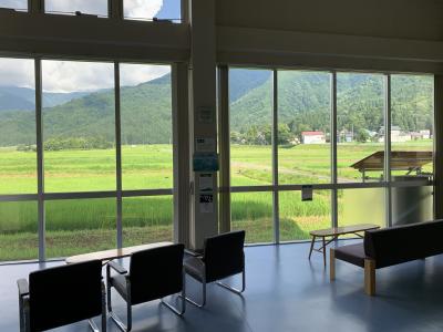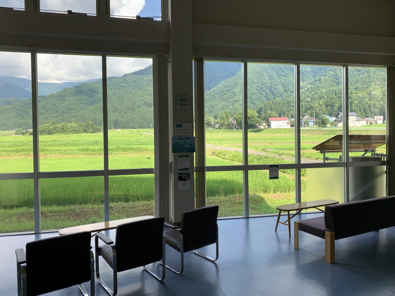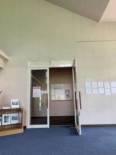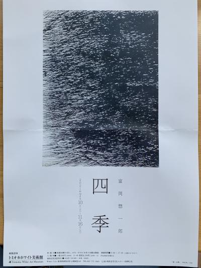 南魚沼市の真ん中ちょっと北あたりです。上越市出身の富岡惣一郎氏(1922-1994)が、自ら開発した白の油絵の具「トミオカホワイト」を用い、ペインティングナイフで描いた独特の白黒の世界観を表す作品の美術館です。内部は撮影禁止ですので入口と展示内容「四季」チラシのみ紹介します。こんな作調です。美術館の傍らには、一面の田んぼを眺めるベンチがポツンと。白黒ではないですがこれも富岡惣一郎氏の世界観に思えます。