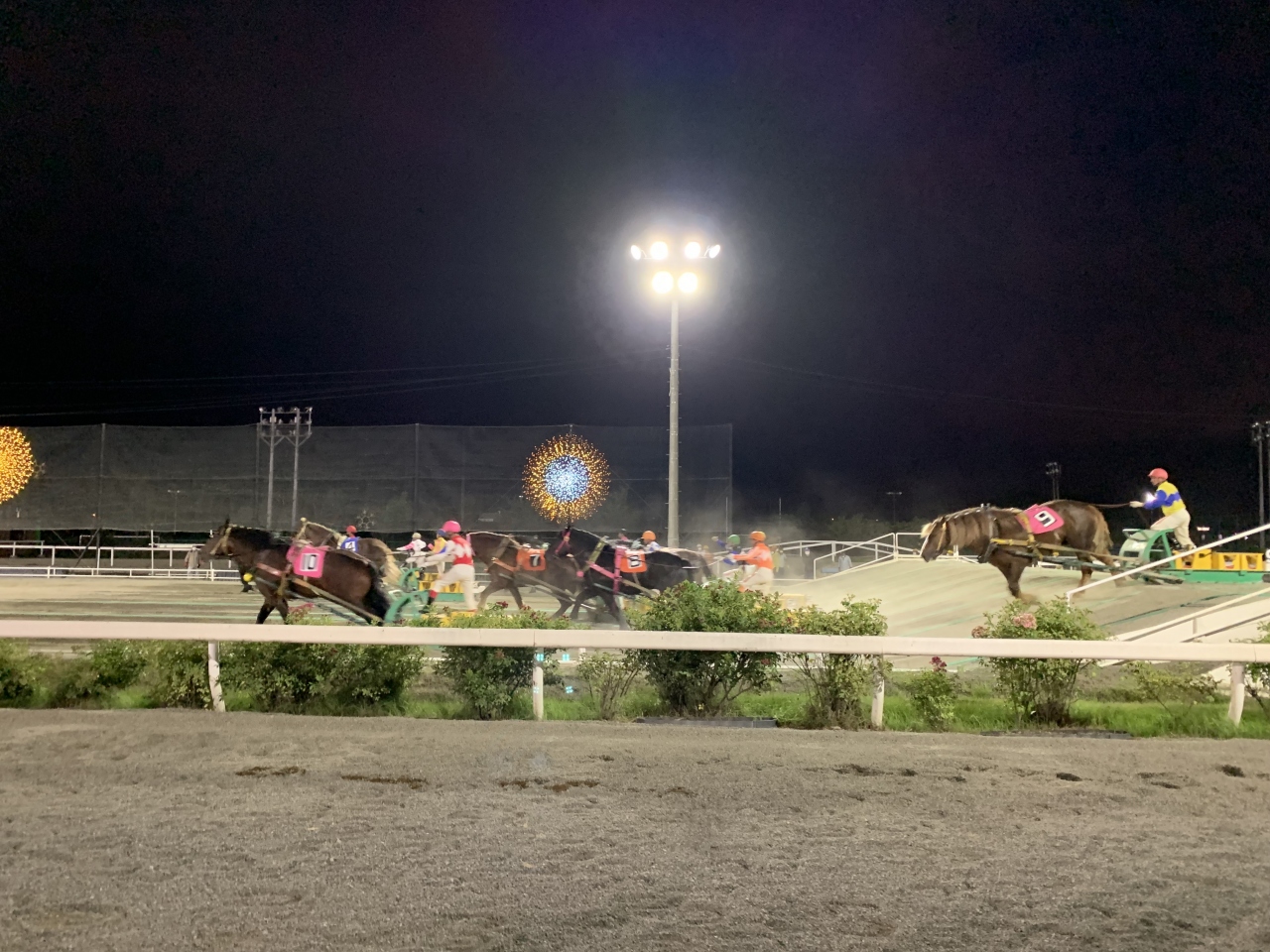 重量450kgにもなる重いソリを引いてダートコースを進みます。障害を越えて…ものすごいパワー、これぞまさに”馬力”。20:10発走の第10レース「第一回とかちえぞまつ特別オープン」、この日のメインレースで3連単的中!配当は131倍でした!思わぬところで旅の資金が増えました。