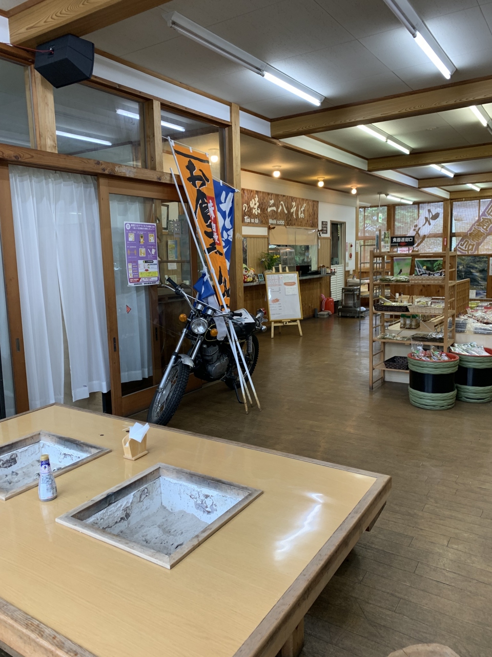 尻焼温泉に向かう途中、「道の駅 六合(くに)」にてランチ休憩、食事処「六合の郷 しらすな」にて。六合の味、”二八そば”をいただきました。妻はもり蕎麦で、私はかけ蕎麦に今日の天ぷら盛り合わせ(舞茸、山芋、よもぎ)を付けてみました。軽くランチのつもりでしたが、思いのほか蕎麦の量が多く腹いっぱいになりました。