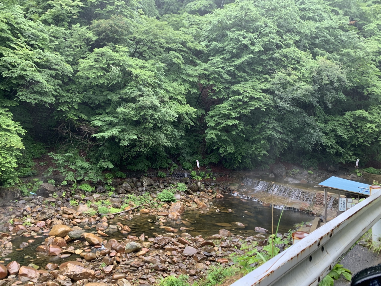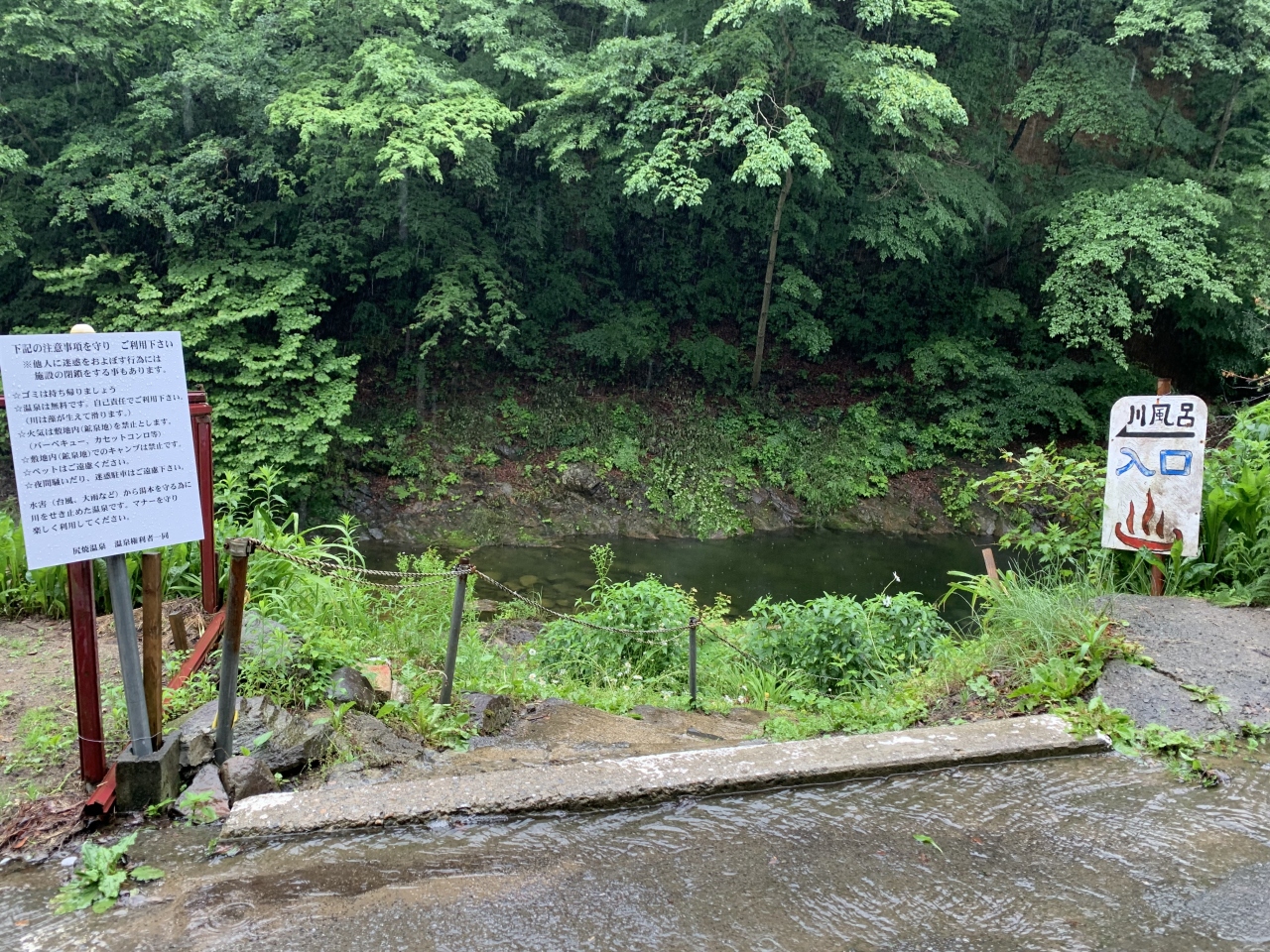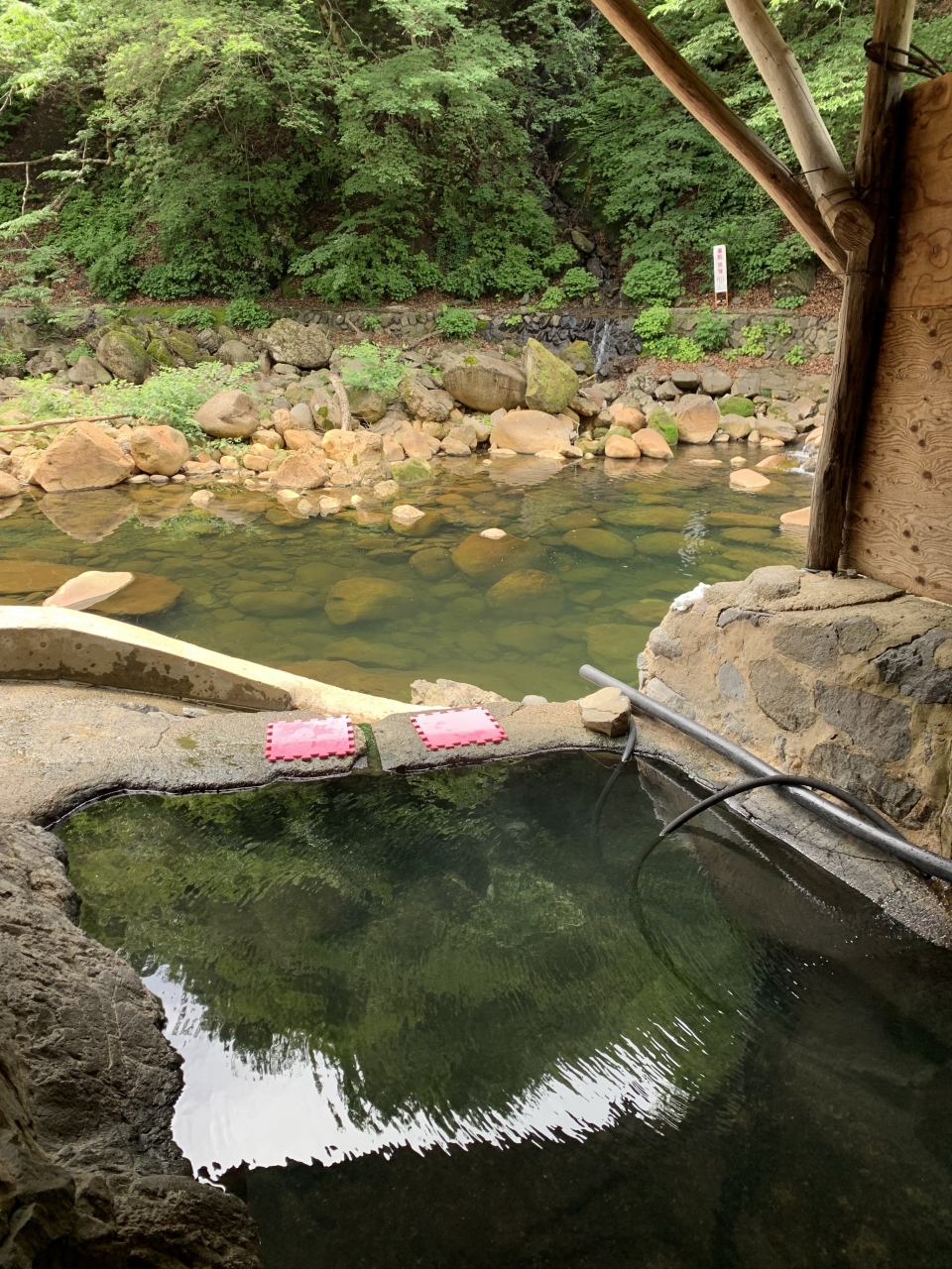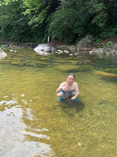 尻焼温泉名物の「川風呂」は、ちょっと離れた専用駐車場から歩いて5分くらいです。川べりを歩いて行ってまず川岸の湯小屋に到達、混浴の野天風呂です。そこを過ぎると川風呂です。川の底の穴からプクプクと泡とともにお湯が出てました。場所によって温度が違うので、場所を選んでぬる湯でいつまでも入ることが出来そうです。ですが、川底がぬるぬるでちょっと気持ち悪い。対岸の方が深くて、そちらに浮き輪で浮かんでいる方もいました。水着可ですが、水着を着ない方もある程度いらっしゃいますのでそれなりのご配慮を。