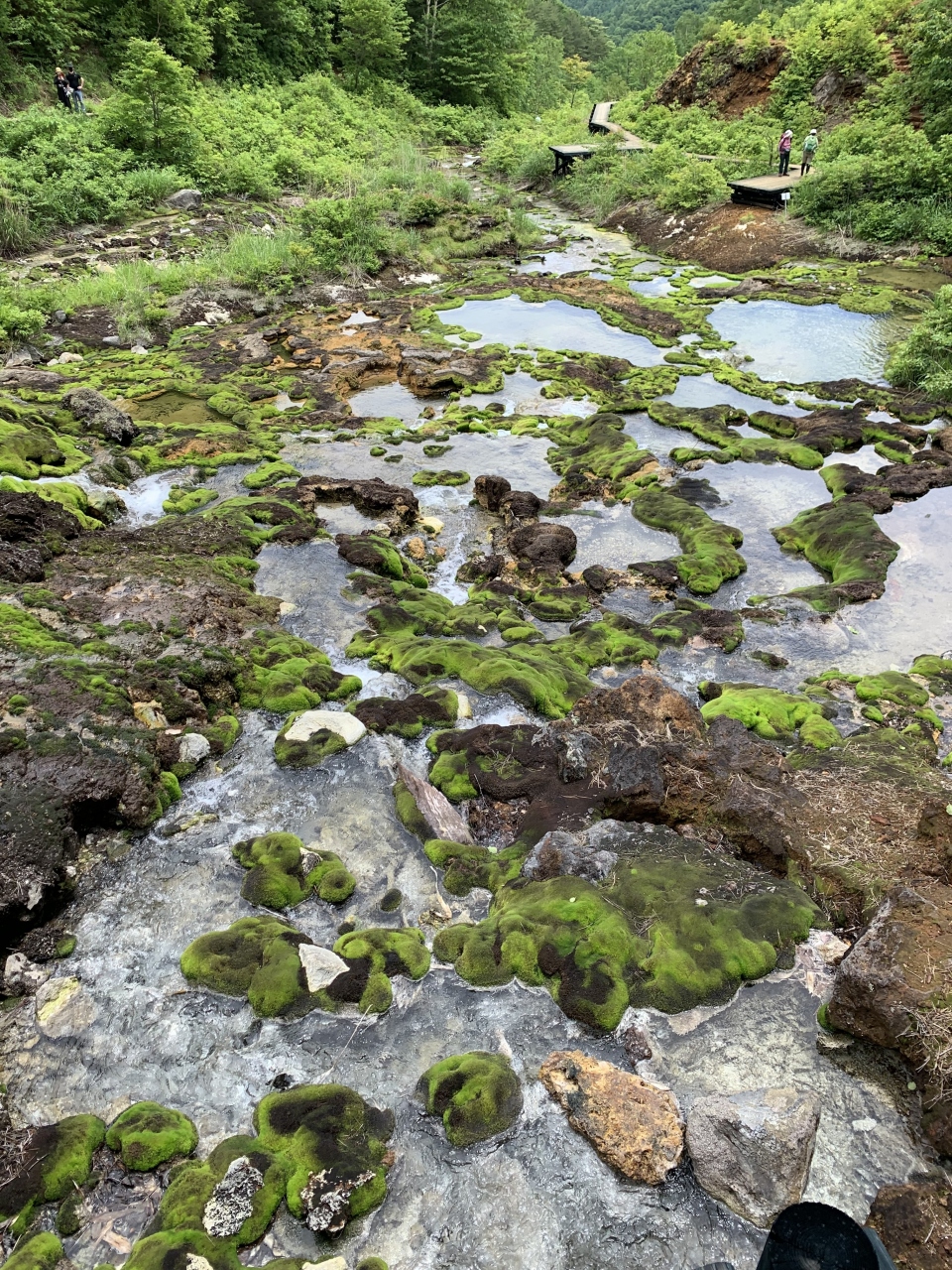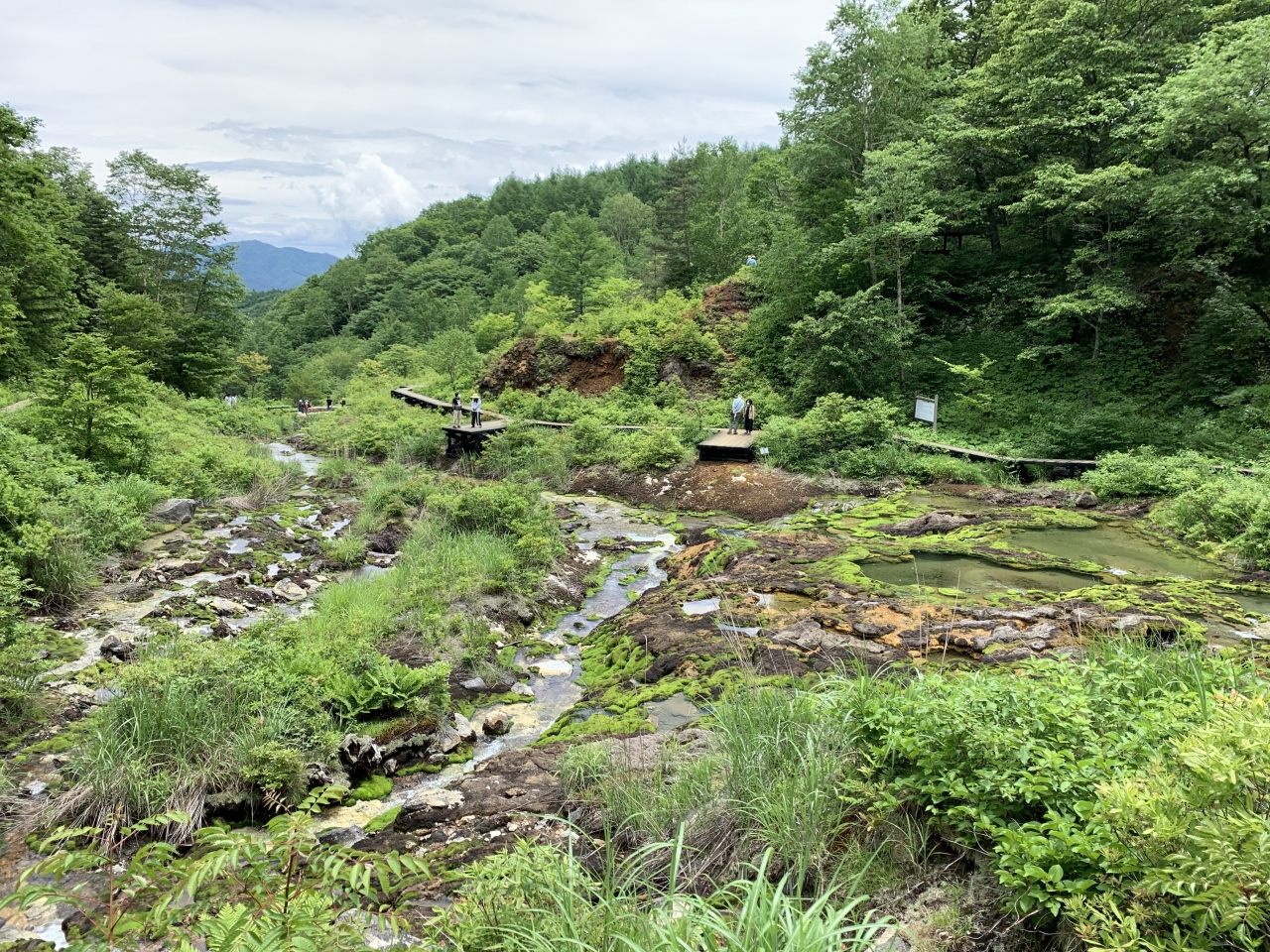 尻焼温泉から西へ4kmほどの「チャツボミゴケ公園」は駐車場も完備。お土産店なども含め、きれいに整備された公園で、ここから「芳ヶ平湿地帯」に入ります。とはいっても、湿地帯の奥に入るわけではなく、遊歩道が整備された道を歩くだけです。1kmほど歩いたでしょうか…穴地獄(チャツボミゴケ群生地)が見えてきました。ここら一帯は、別口コミの旧太子(おおし)駅の紹介でも登場した「群馬鉄山」の露天掘りの跡地なのだそうです。で、”チャツボミゴケ”は強酸性の鉱泉を好んで自生する珍しい苔で、日本ではここと阿蘇でしかお目にかかれないらしい。苔と鉄バクテリアの生物活動の副産物として鉄鉱が生成されるんですと。これはスゴイ、貴重なものを見ることができました。穴地獄に張り付いたチャツボミゴケはまさに”モスグリーン”。この場所は鉄鉱生成の歴史とその仕組みを観察できる貴重な場所として、湧水や微生物を含む河床、チャツボミゴケ群落、鉄鉱石の分布域が国の天然記念物に指定されています。