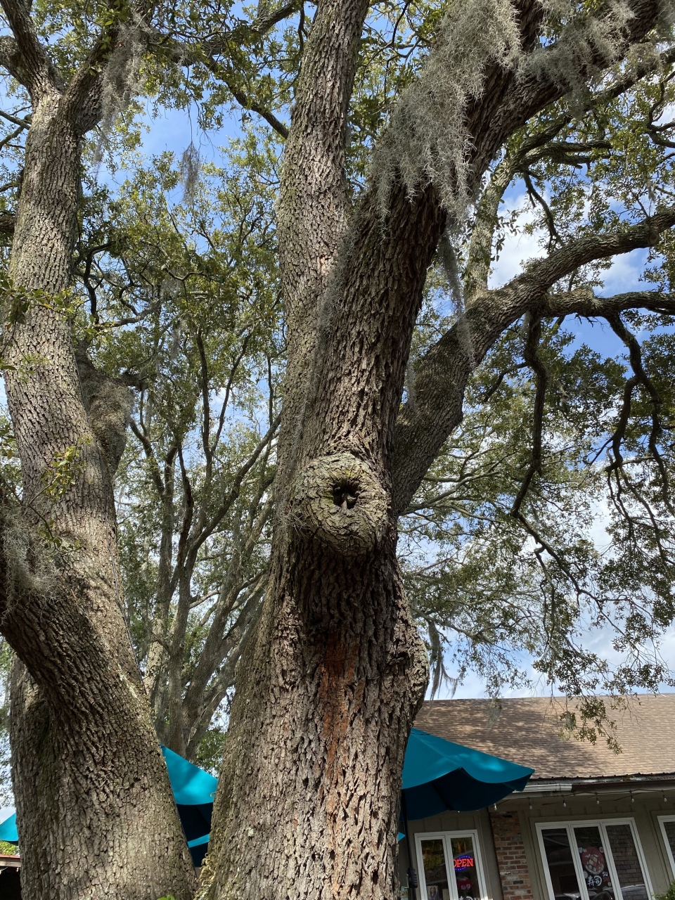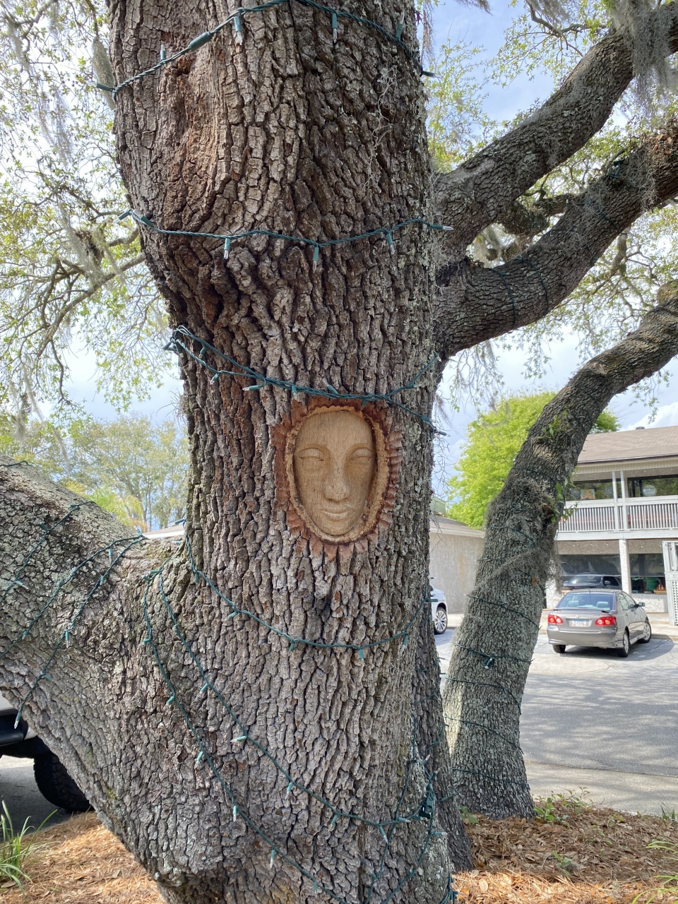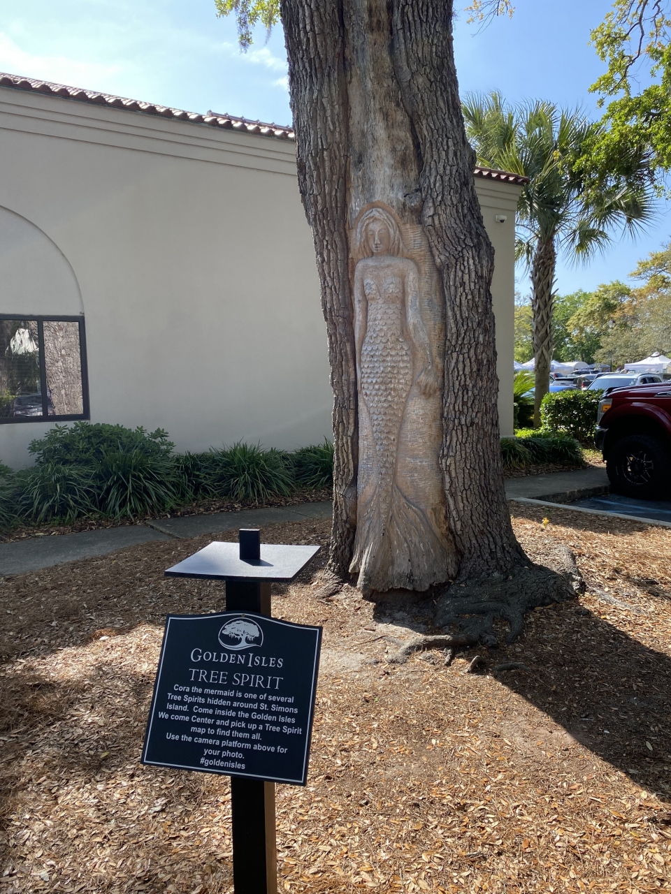 ゴールデンアイルズ、セントシモンズ島のウエルカムセンターの裏手には木に彫刻が。こういう彫刻が町に点在していて、地図を基にそれらを探すというアトラクションが「ツリー・スピリット」です。1980年代、地元のアーティストが島の有名なオークの木に約20の顔を彫りました。私たちが探していると、同じく探している他の観光客に出会い、「あっちにもあったけどもう見たかい?」みたいなコミュニケーションも楽しいです。
