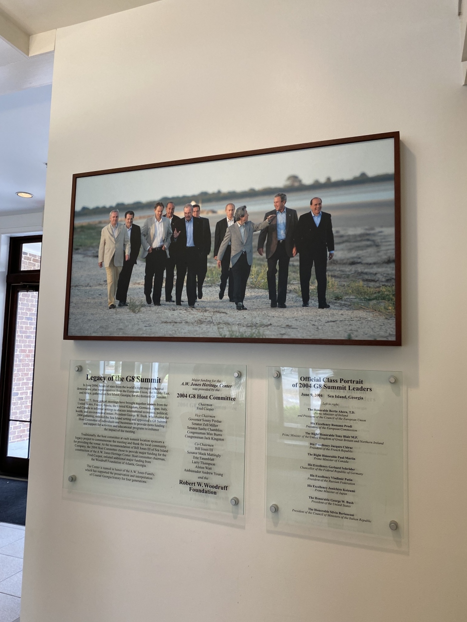 灯台の横に「A.W.ジョーンズ・ヘリテージ・センター(A.W.Jones Heritage Center)」、ジョージア州沿岸歴史協会の本部があります。2004年にゴールデン・アイルズの島の一つである「シー島」にて、第30回主要国首脳会議、いわゆるG8「シーアイランド・サミット」が開催されました。その際に建てられたのがこの建物で、歴史協会に3代に渡り多大な貢献をしてきたジョーンズ家の名が付けられたそうです。シーアイランド・サミットの写真が飾られていました。当時の米大統領はJ.W.ブッシュ氏、日本の総理は小泉氏、他にはロシアのプーチン氏、イタリアのベルルスコーニ氏、などが写っていました。その他にも、ゴールデンアイルズの歴史やゆかりある人物が紹介されています。