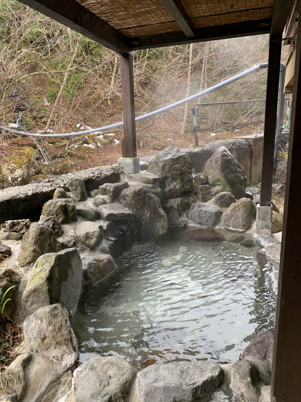 福島県の中通り、天栄村の二岐山のふもとの二俣川の谷の斜面に建てられた、5つの源泉に5つの湯をもつ秘湯の温泉宿です。建物設備は少々年季が入ってそうですが、館内はきれいで居心地は良かったです。全ての温泉が自然湧出の源泉かけ流しで24時間入浴可能で泉質は良かったです。特に、足元から源泉が湧き出る自噴巌風呂が貸切で入れたのは最高でした。夕食は料金からするともう少しひねりが欲しかったところですが、会津坂下の馬刺しが付いていたのは良かったです。