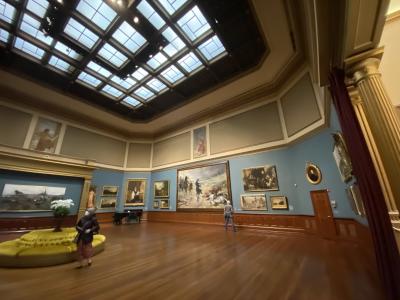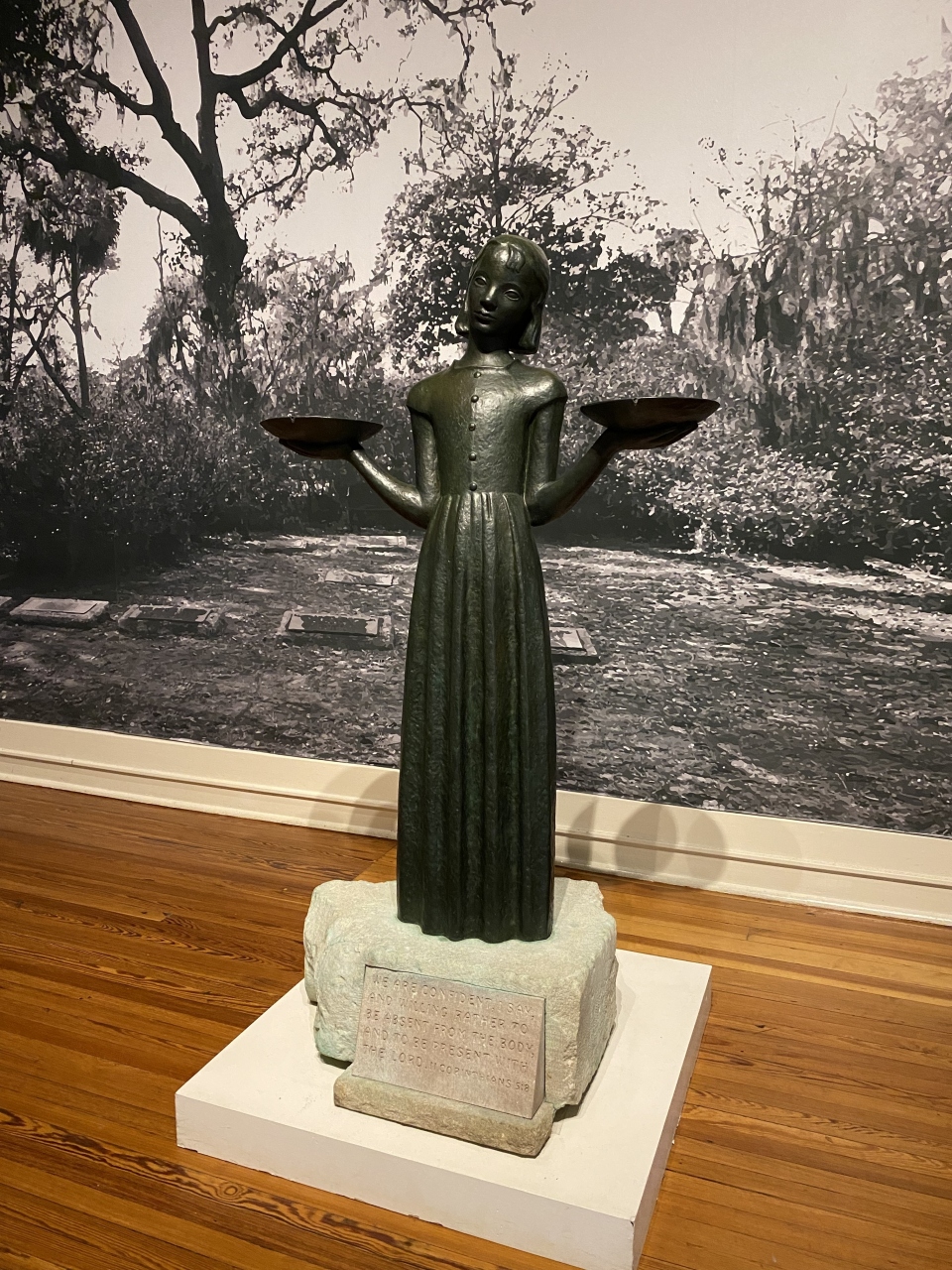 ジェプソン・センターのすぐ近くに建つ「テルフェア・アカデミー」は、イギリスの建築家ウィリアム・ジェイによって、1819年に建てられたリージェンシー様式の邸宅です。1819年にジェームズ・ライト知事の公邸である旧植民地総督邸の敷地内に建設された、”ロイヤリスト”(占領しているイギリス王側の人のこと。対して後に独立したアメリカ側の人は”パトリオット”と呼ばれた)アレクサンダー・テルフェアの邸宅です。1875年、アレクサンダーの妹メアリー(家族の財産の相続人であり、最後にテルフェアの名前を冠した)は、家とその家具をジョージア歴史協会に遺贈し、博物館としてオープンしたそうです。ジョージア歴史協会が雇ったドイツ生まれの芸術家カール・ブラントがニューヨークやサヴァンナの建築家と協力し、新しいアートコレクションを収容するためテルフェア家を改造して博物館としたそうです。1886年に南部で最も古い公立美術館であるとともに、女性によって設立された米国で最初の美術館だったらしい。「バード・ガール」がこのギャラリーの目玉展示とも言える彫刻です。元々、サヴァンナ郊外のボナベンチャー墓地に置かれていたのですが、プライバシーと保存のためにテルフェア博物館に移されたそうです。ピューリッツァー賞候補だったアメリカの作家ジョン・ベレントが1994年に出版した、「善悪の園の真夜中」というノンフィクション小説の表紙を飾ったことで有名になり、墓地に置いておくと色々と問題が生じたためここに移されたそうです。小説はクリント・イーストウッド監督で「真夜中のサバナ」として映画化されました。