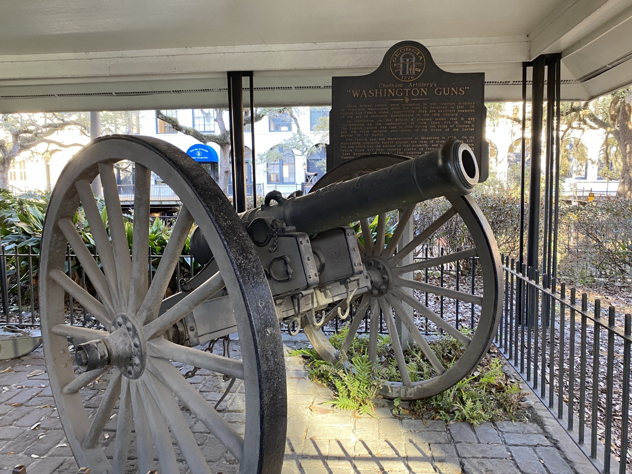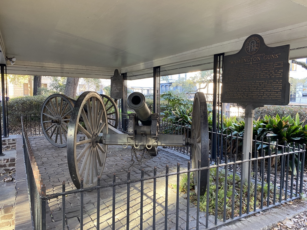 アメリカ独立戦争で、イギリスの将軍コーンウォリス卿がヨークタウンの戦いで降伏した際に奪取した大砲が、ジョージワシントン大統領によりサヴァンナを防衛するチャタム砲兵隊へ贈られました。その大砲を修復したものらしい。小さいけれどアメリカ独立の歴史を感じられる一つのモニュメントです。