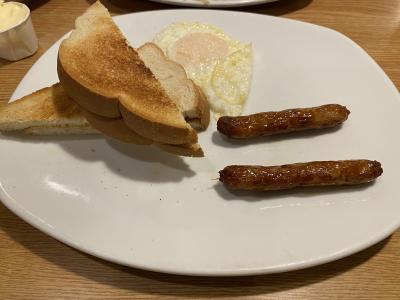 アメリカ東部・中部をメインにチェーン展開されているレストラン&ベーカリーです。結構な人気で、朝食どきに訪れると20分ほど待たされました。レストランというだけあって、I-HOPやWaffle Houseなどとは違ってかなり開放的な空間です。まずはお決まりのコーヒー。例の薄いヤツ...アメリカのこういう店ではコーヒーはもはやお茶がわりで、脂っこい食事の合間に飲んでおかわりします。...が、コーヒーはWaffle Houseよりは上質かも。妻はオムレツメニューの「ジ・エブリシング」をチョイス。角切りハムにマッシュルーム、トマト、オニオン、グリーンペッパー、チーズが入ったオムレツ。パンケーキがついてます。私はクラシックメニューのひとつである「ファビュラス・ファイブ」、目玉焼き一つにソーセージとトースト、そしてこちらもパンケーキ付。アメリカの朝食はやはりパンケーキが欠かせません。美味しくかつ満腹になりました。レストラン&ベーカリーなので、パンやケーキなども持ち帰りできます。