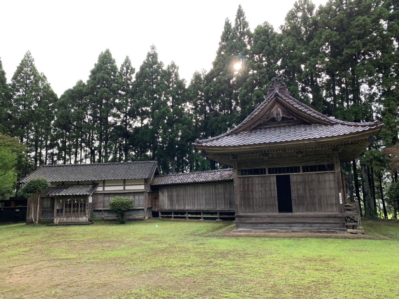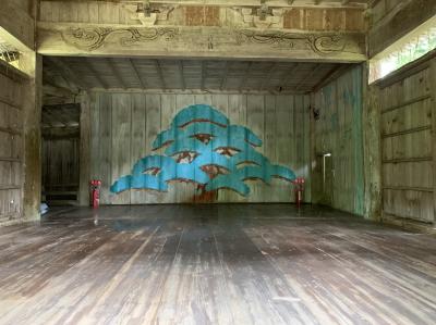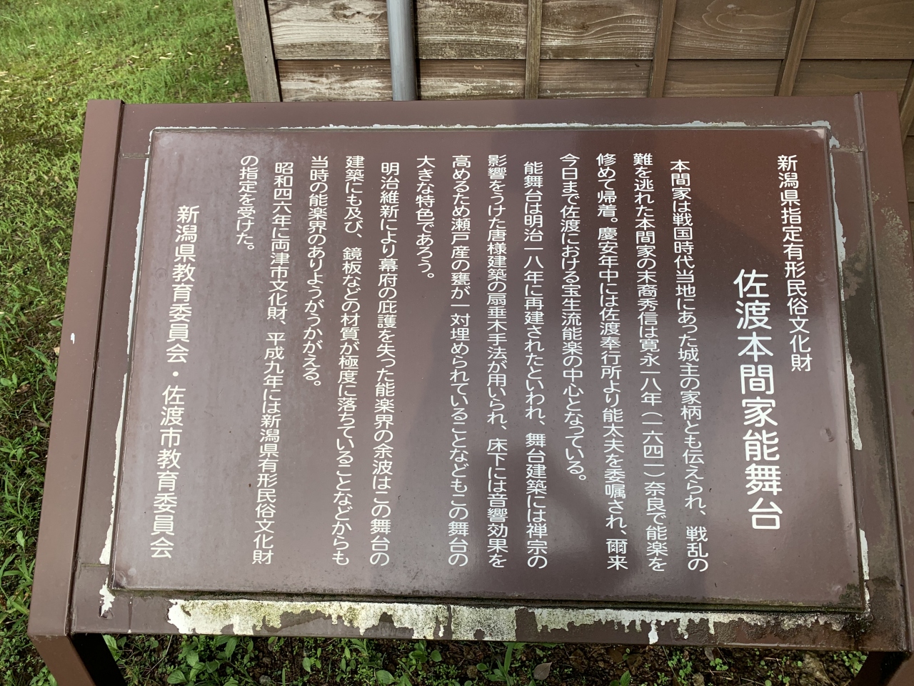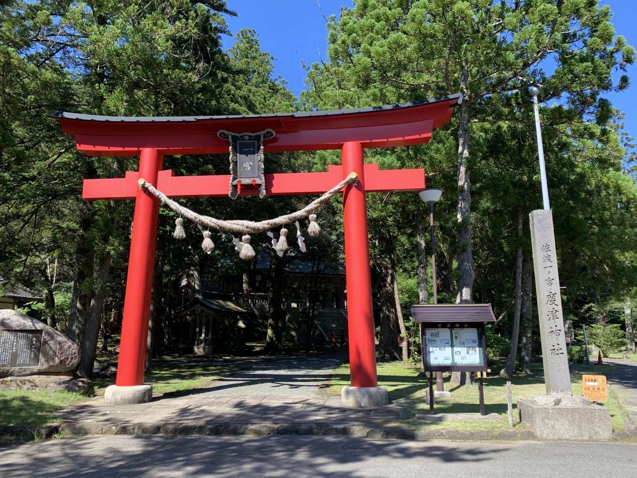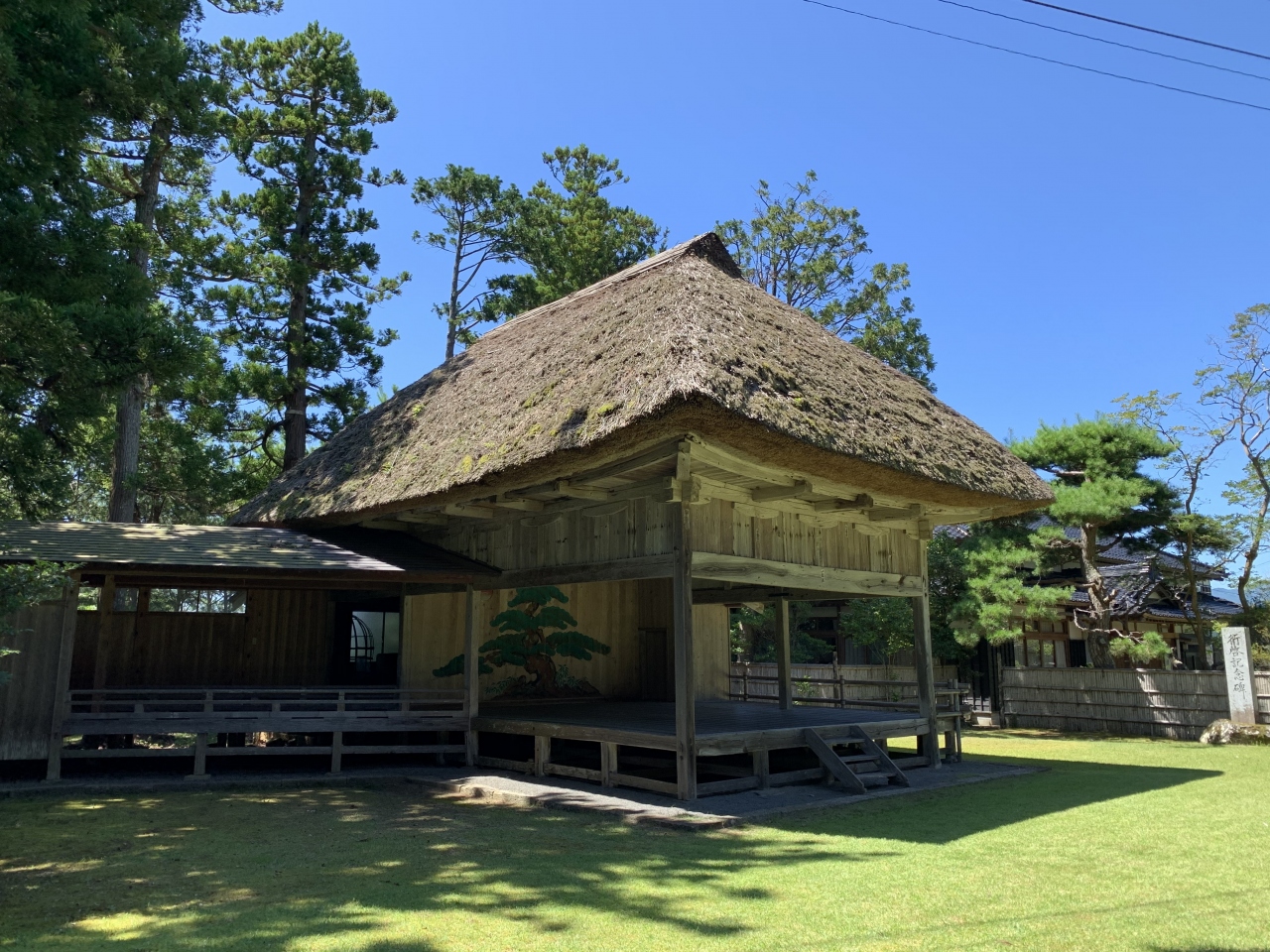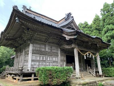「潟上の天王さん」の愛称で親しまれているそうです。奈良~平安時代の延暦11年(792年)、出雲大社より大国主命などを勧請(神仏の分身・分霊を他の地に移してまつること)して建てられたそうです。再建された拝殿は精細な彫刻が見事、鯉の泳ぐ姿や順徳上皇の物語絵などの彫刻らしい。明治34年(1901年)に再建されたという能舞台は県有形民俗文化財とのこと。「国仲四所の御能場」のうちの一つなのだそう。佐渡は室町時代に申楽(能楽の祖形)師だった世阿弥が流された島ですが、能文化は江戸時代の初代佐渡奉行の大久保長安がもたらしたとされています。室町期の能面「翁面」と「三番叟面」(県有形文化財)が社の宝物となっているということから、古くから能が演じられていたことがうかがえますね。