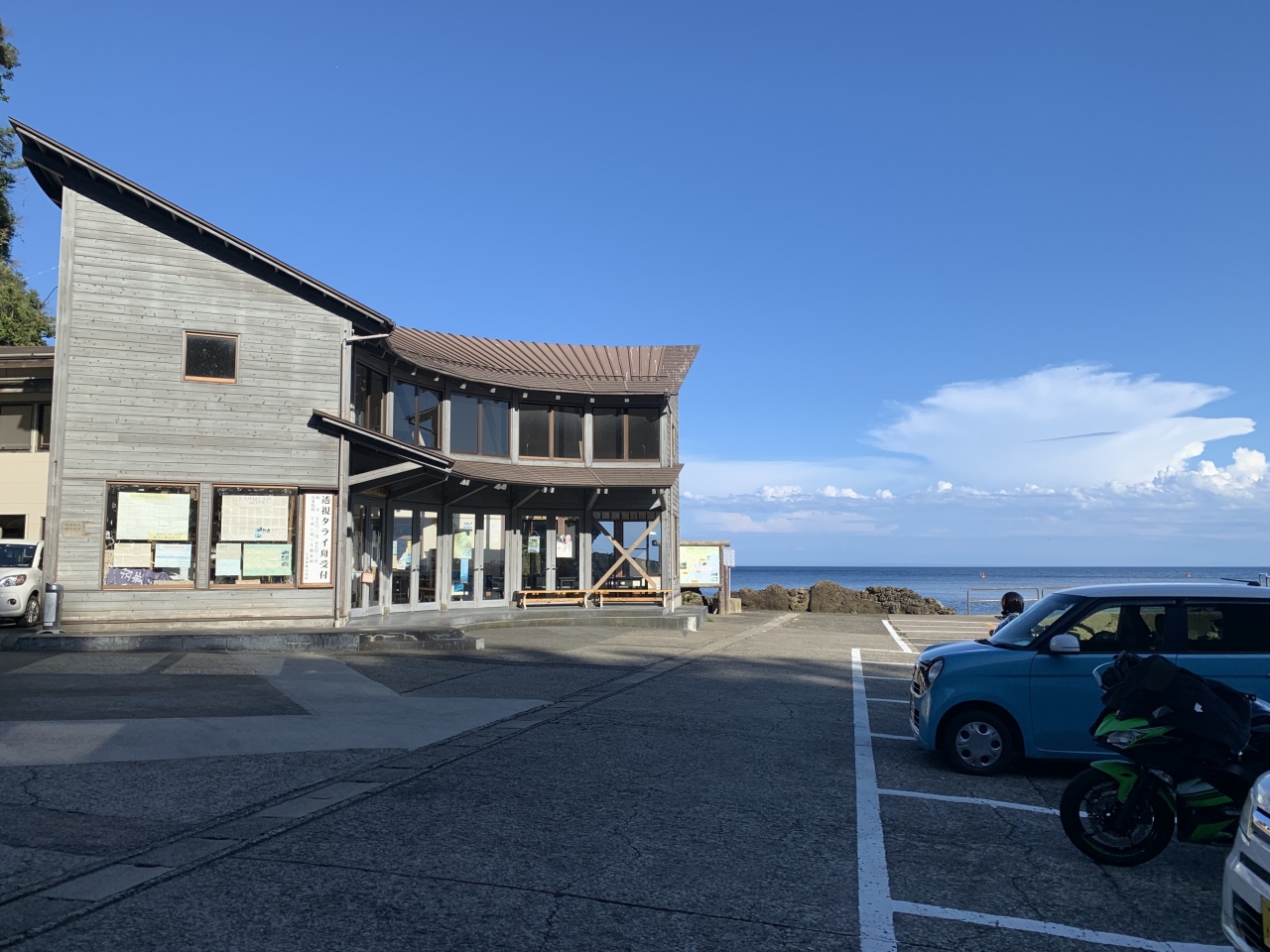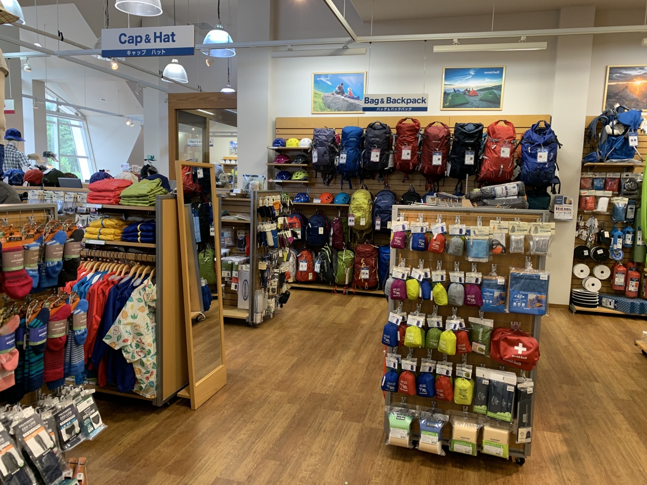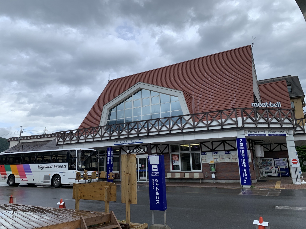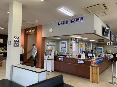バスターミナルがあり、観光案内所でもあり、モンベルのショップもあります。1階はバスのチケット売り場、CHUMSやNORTH FACEなどを扱うショップ、カフェカウンターなど。2階にはmon-bellがありアウトドアの現地調達も不自由なしです。