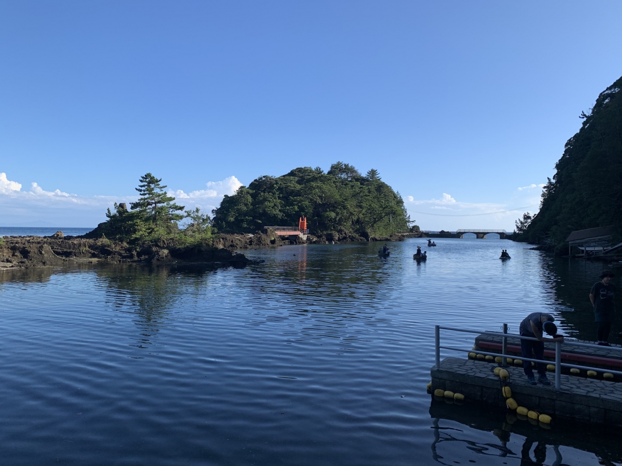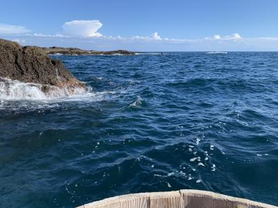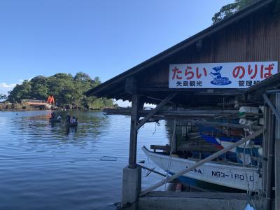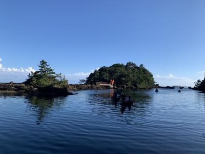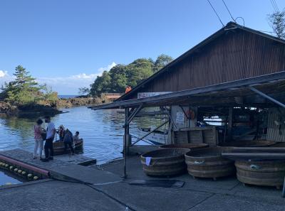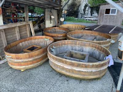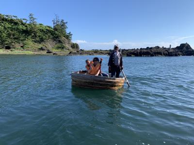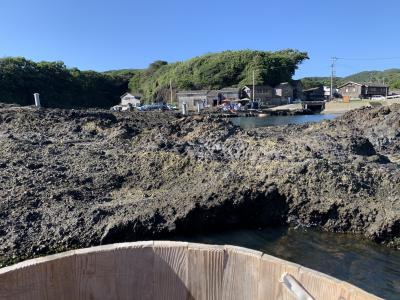 小木海岸は、小木の城山台から沢崎の神子岩まで連なる約16kmの海岸線とのことですが、その海岸線の中でかつては「大浜」と呼ばれた宿根木海岸を紹介。「はんぎり」…たらい舟、だいぶ日が傾いてましたがまだ営業中でした。はんぎりは、古くから小木半島の人々の生活を支えた漁具でした。職人によって杉と竹だけで手作りで作られたとのこと。このたらい一つで結構沖まで行くんです。巧みに岩場を避け櫂一本で思い通りに進んでいきます。進む速度も思ったより速く、ベテラン船頭さんの技術と体力に驚愕。15分くらいのクルージングを終え引き返しました。いい体験ができました。宿根木のたらい舟は、この後に向かう矢島・経島のたらい舟と違って本物の天然素材のたらい舟でした。