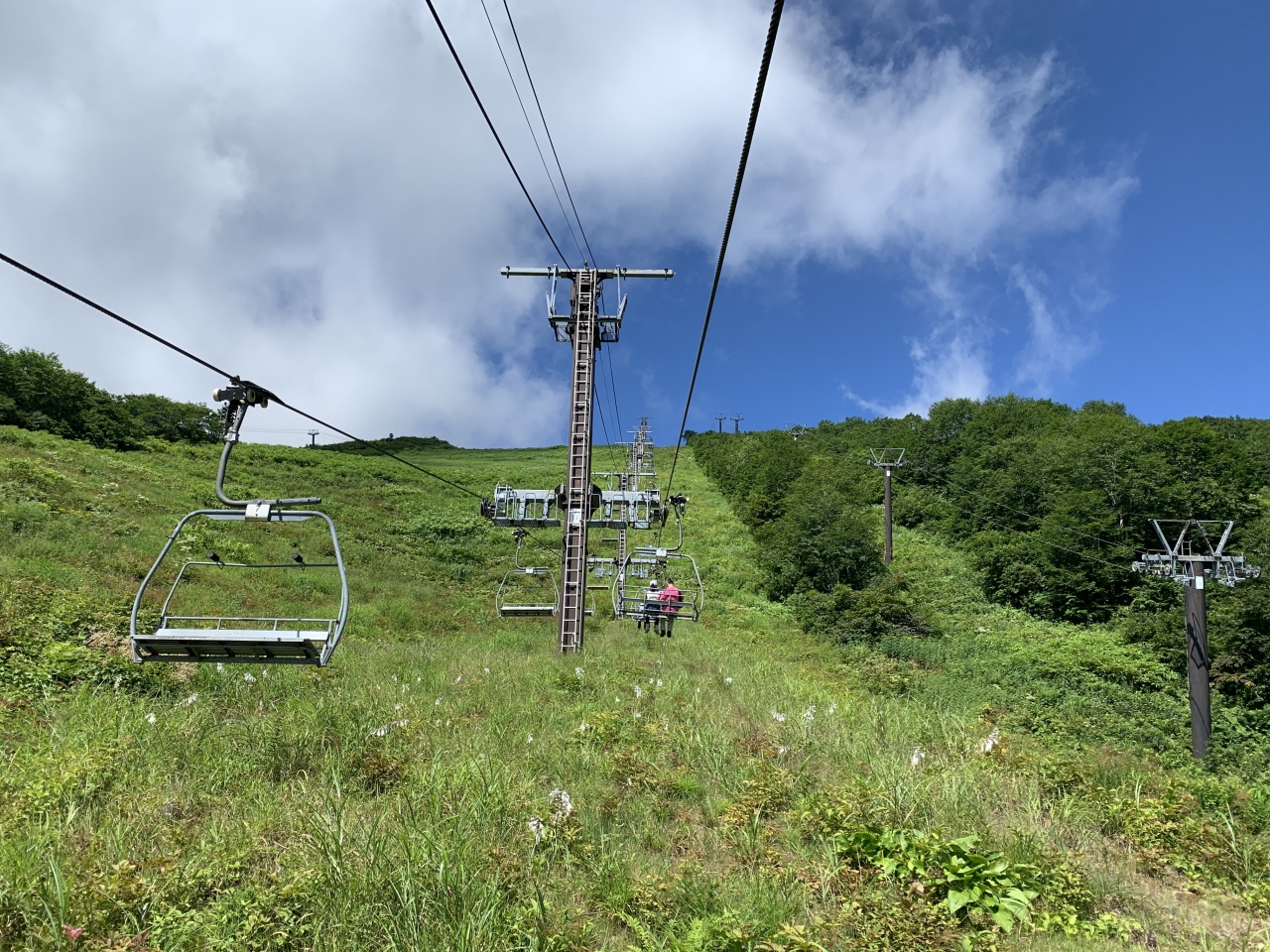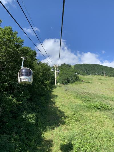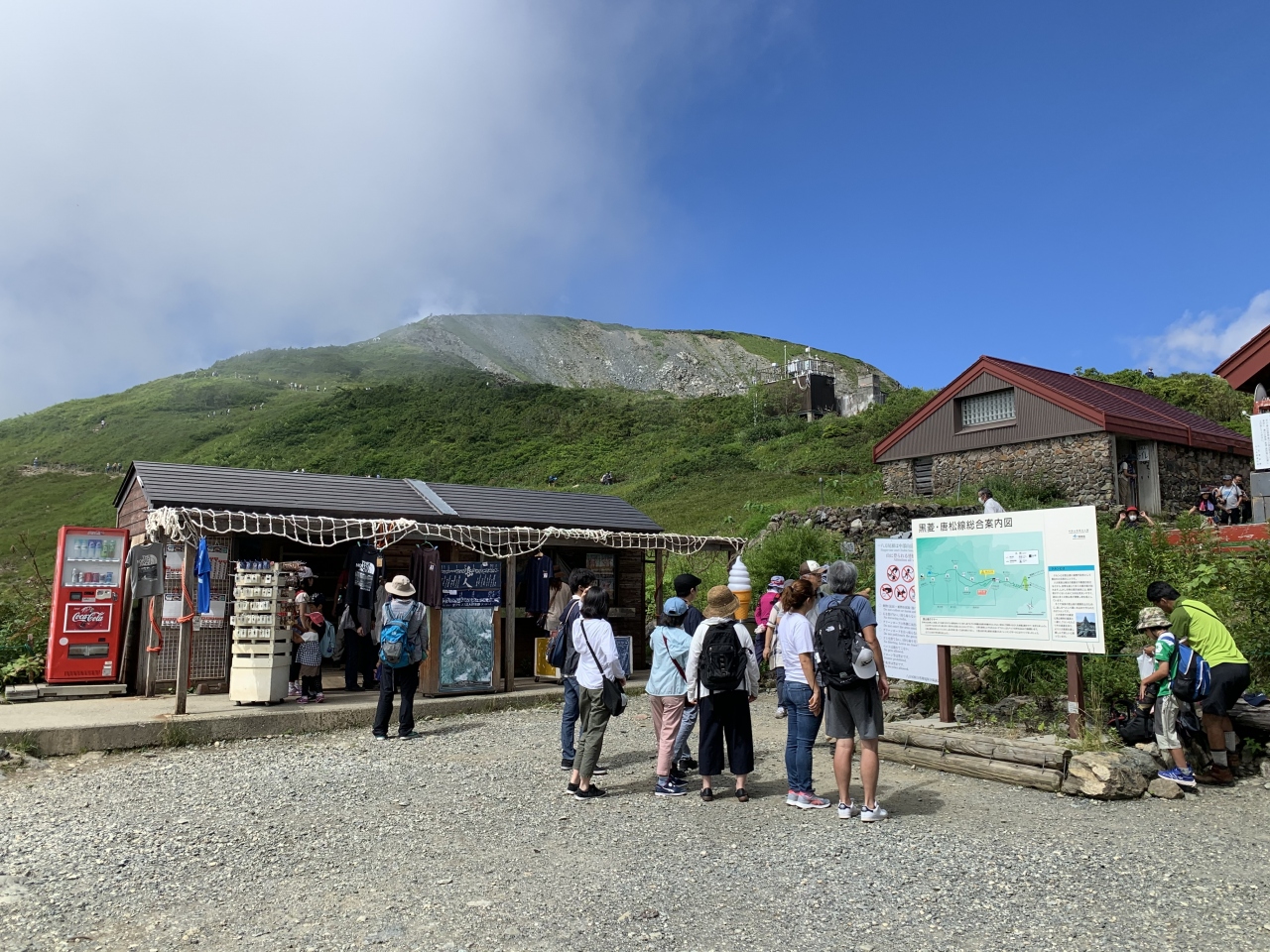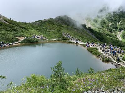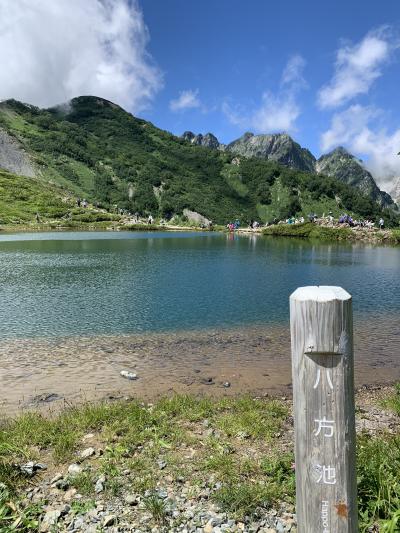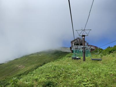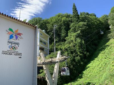 八方池までのトrッキング、行きは「八方アルペンライン」、帰りは「黒菱ライン」にし、あえて違うルートを楽しむことにします。八方ゴンドラリフトの八方駅にてチケットを購入、夏休みで天気も良いので結構並んでいました。「八方アルペンライン」は、八方ゴンドラリフト”アダム”、アルペンクワッドリフト、グラートクワッドリフトの3つからなるの総延長は3,445m、標高差1,060mを一気に登ります。八方ゴンドラリフト”アダム”の終点で「うさぎ平テラス」に寄り、続いて「アルペンクワッドリフト」へ。最後に「グラートクワッドリフト」に乗って第1ケルン、八方池山荘へ。八方アルペンラインを使えば、いい景色を見ながら下から40分ほどで標高1,830mの第1ケルン、八方池山荘へ到達できました。