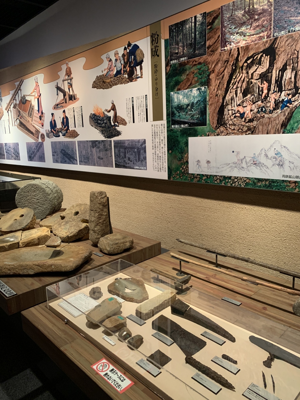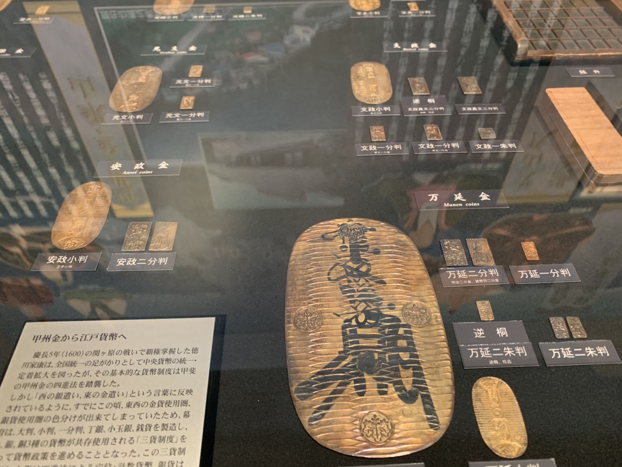 下部温泉駅からそう遠くない、下部川を渡ったところにあります。「武田信玄の隠し金山」とも呼ばれた「湯之奥金山」に関する博物館です。湯之奥金山は、ここから南東に数kmの山中にありましたので、坑道跡を歩いたりといった展示はありません(坑道実物大の紙模型はありました)。甲斐の国を本国とした武田氏は、信玄とその子勝頼の時代に支配領域を最も拡大し、湯之奥金山(中山・内山・茅小屋の金山の総称)もその支配下にあったとのこと。中山金山は最も古い金山の一つとされており、武田家が戦国大名となる前の15世紀末頃に操業され、信玄の時代には大賑わいだったと考えられているそうな。その後、江戸時代中期の18世紀まで操業が続けられ、甲斐国屈指の金山跡として平成9年(1997年)に国史跡に指定されています。金採掘に関わる道具や精錬の様子、製造していた金貨など、様々な史料を観ることができました。体験しませんでしたが、「砂金堀体験室」もあります。