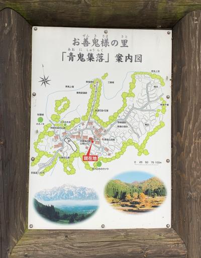 白馬駅から6kmほど北東にある「青鬼(あおに)集落」。白馬の重要伝統的建造物群保存地区に指定されています。一応観光用の駐車場があり、協力金500円を箱に入れます。集落内には、縄文時代の善鬼堂遺跡や番場遺跡があり、古くから人が住んでいたと考えられているそうですが、現在の集落は江戸末期から明治初期に建てられたものだそう。かつては茅葺きだった屋根は鉄板の被覆に造り替えられています。”お善鬼(ぜんき)様”とは、伝説によると隣村に鬼が現れ悪事を働いたので村人が近くの大穴に閉じ込めたところ、不思議な事に鬼はこの村に現れ今度は村の発展に尽力したので、神の使い「お善鬼様」として祀られるようになったそうです。鬼を追い出した隣村を鬼無里(きなさ)村、大穴に閉じ込めた村を戸隠村、「お善鬼様」を祀ったこの村を青鬼村と呼ぶようになったのだとか。(青鬼村は、現在は白馬村の青鬼地区) 村の建物だけでなく、山側から見下ろす棚田もみどころです。