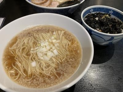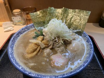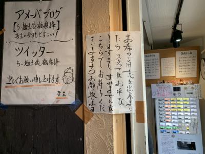京急鶴見駅から歩いて3分、JR鶴見駅から歩いて5分です。車で訪れましたが、駐車場はありませんので近くのコインパーキングを利用しました。入口で2人分「鶴嶺峰らー麺(並)」「鶴嶺峰つけ麺(並)」の食券を買ってカウンターへ(席はカウンター8席のみ)。らー麺は、いわゆる魚介豚骨系スープですが、他店のそれとは若干違った個性を感じました。見た目は濃厚ドロドロで泡まで立ってるのですが、これ見よがしに背油や油膜が浮いていません。あくまで私の舌が感じですが、ちゃんこ鍋のスープのような甘味と野菜の繊維(これがドロドロの一部ではないか?)に、動物系油分や塩分が絶妙のバランスで溶け込んでいる感じです。麺も具の豚バラ肉や玉ねぎや巾着もスープに合い、これが本当に美味いのです。この店は私にとって、他の魚介豚骨とは明らかに一線を画す存在です。