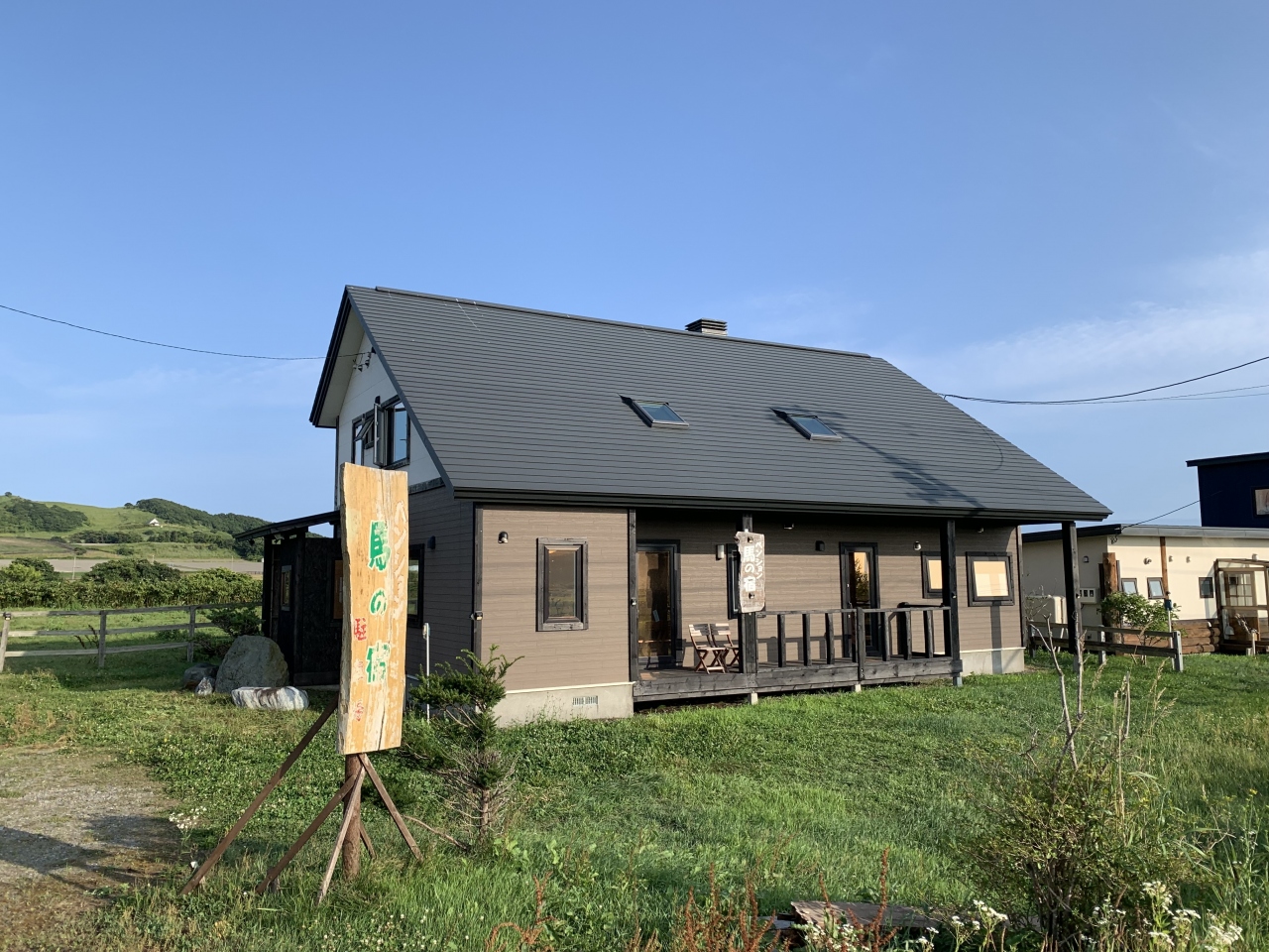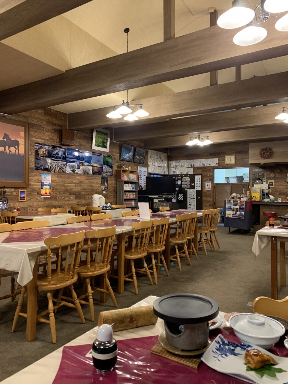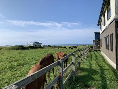 海に近い東栄という地区の、馬牧場に囲まれたペンションです。新築なのがきれいなログ風のハウス(シェアハウスのような宿泊棟)に寝泊まりし、食事は別棟の宿の食事処「夢窓庵」にていただきます。テラスから牧場が見渡せ、大きなベッドがある広い客室でした。宿泊客は同じ棟には他に居らず(別棟は他にもあり、そちらには別のグループが宿泊)、風呂もキッチンも自由に使えました(リビングのテレビが使用不可となっておりこれだけは不便でした)。何しろ周囲が全てサラブレッドの牧場ですので、一歩外へ出れば馬たちが間近で、人懐っこいので寄ってきます(馬は牧場で飼われているので触れたりエサをあげたりは出来ません)。食事は夢窓庵の1階レストランで生ラムコースをいただき(海産物コースも選べます、予約時に選択)、朝食は同じく夢窓庵の2階で海と牧場を眺めながら、という趣向。滞在中はフレンドリーな女将さんが終始明るく対応してくれました。日高地方に泊まるならサラブレッドに触れあえるところで...ということで選びましたが、普通の宿での宿泊ではなかなか無い体験ができました。