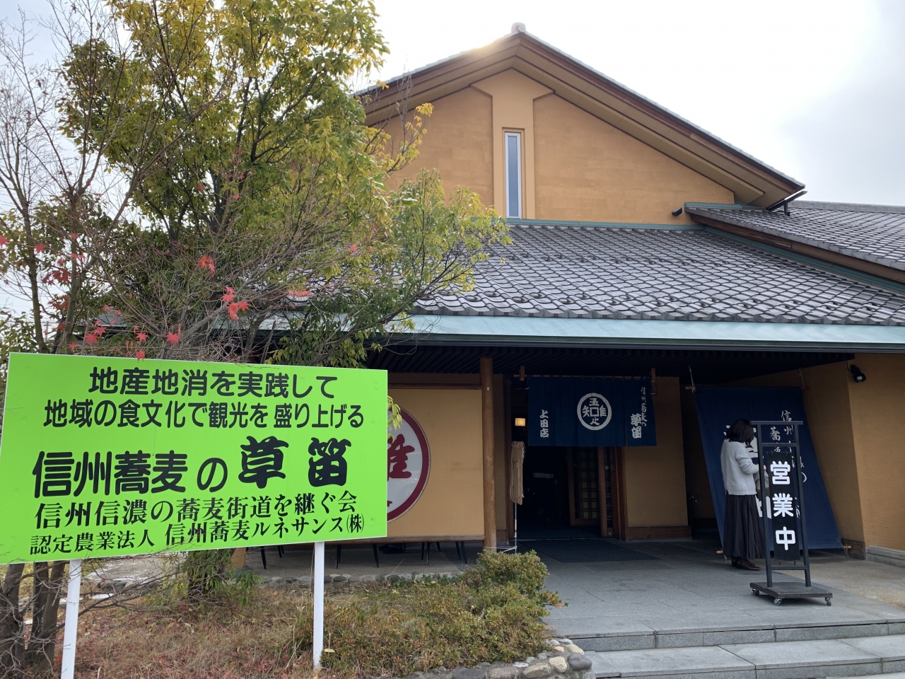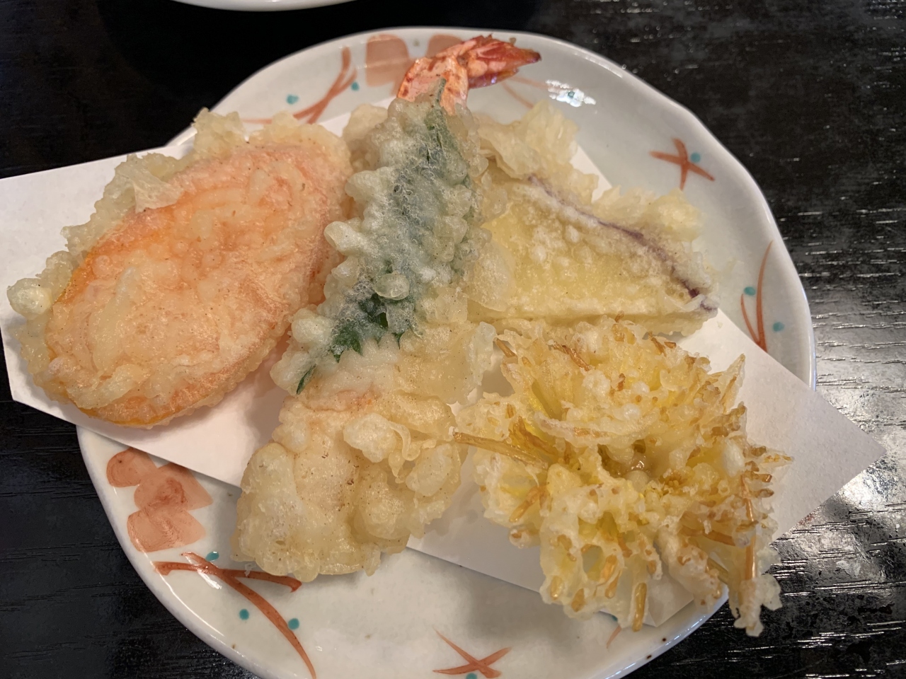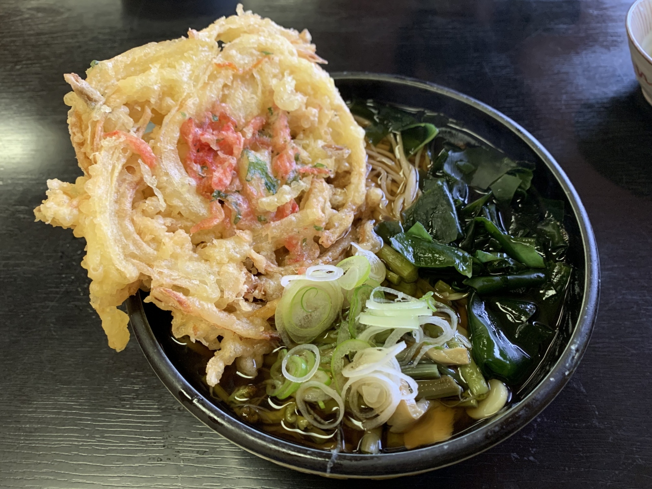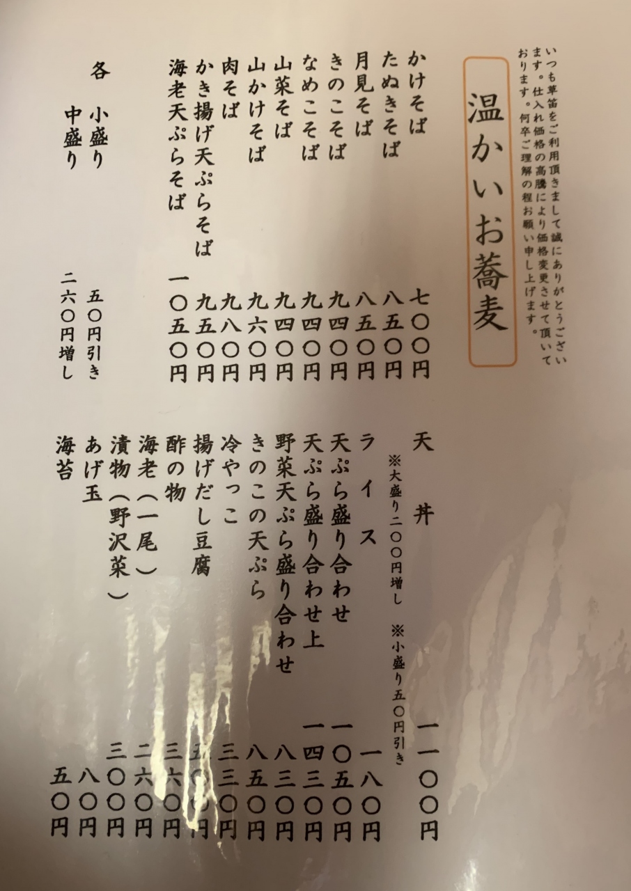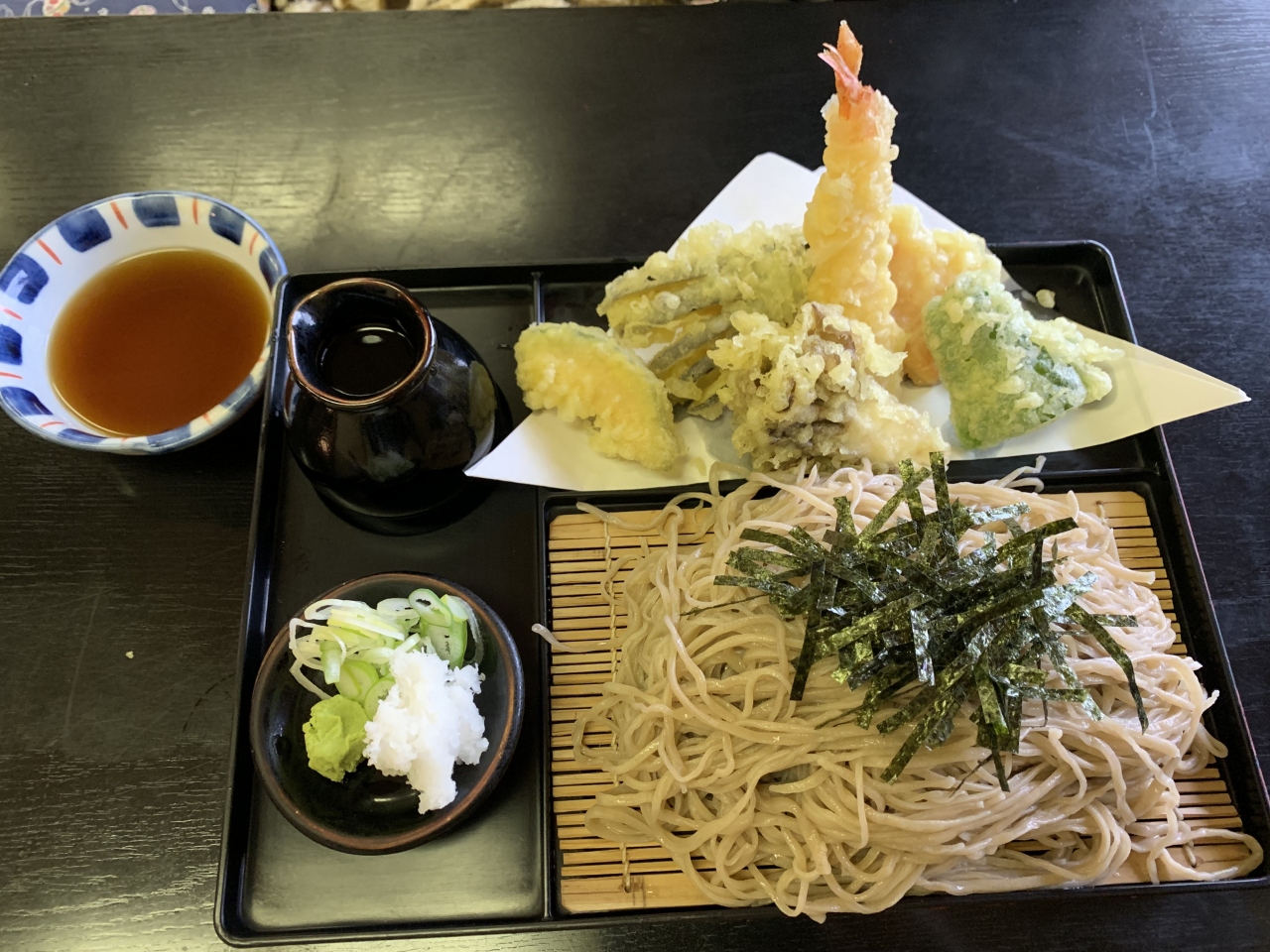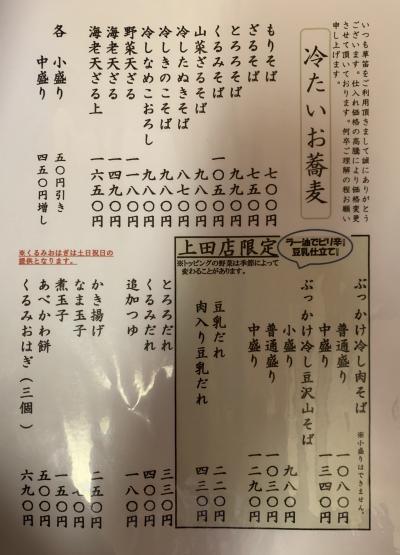 小諸に本店がある信州蕎麦の老舗であり行列店です。ちょうどお昼時に訪れたらやはり満席で結構な行列、蕎麦打ちを見学しながら待ちます。30分ほど待って座敷席に着席。私は「かき揚げ天ぷらそば」、妻は「海老天ざる」をチョイス。まず、量は結構多いです。天ざる蕎麦は香りもよく美味しかった(妻談)とのこと。かき揚げ蕎麦は、かき揚げと山菜は良かったものの蕎麦の量が多すぎつゆが少ないので、温そば好きにはちょっと不満が残りました。