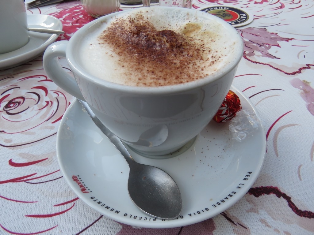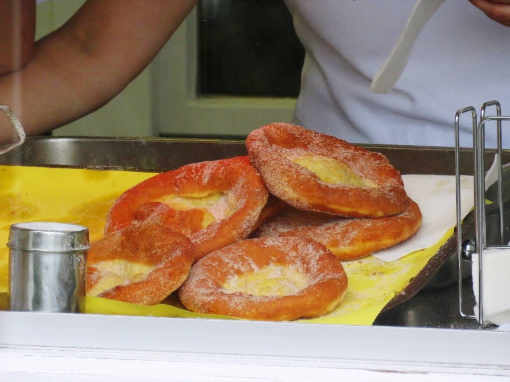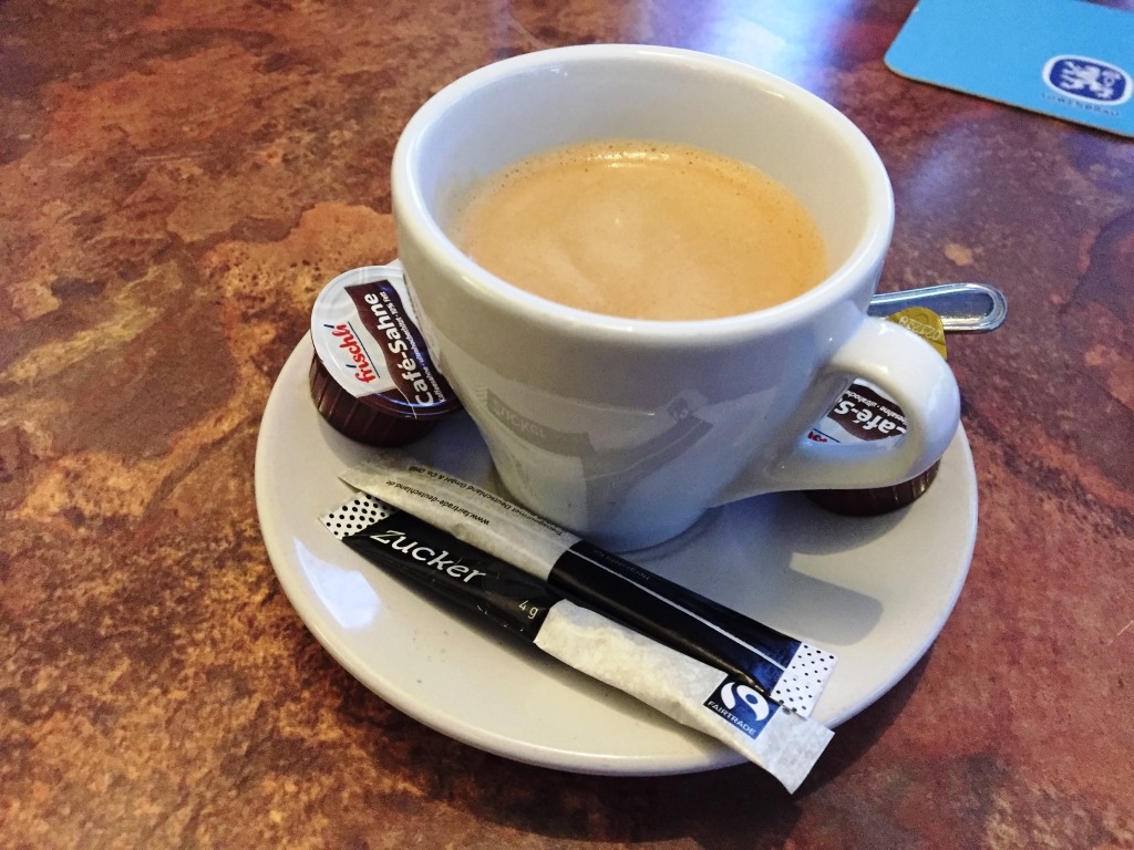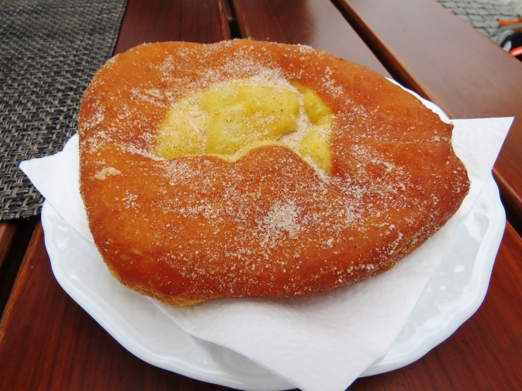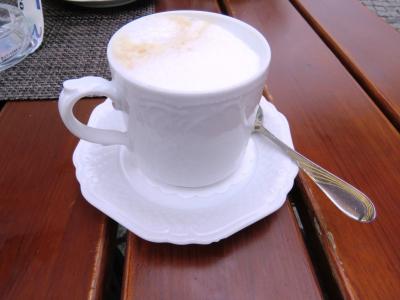 ヴィース教会の傍にあるのですぐに立ち寄れます。建物内ではなくテラスでカフェしました。カフェのスタンドで買った名物の「ヴィース・キュヘル」(揚げパン)は、シナモンが薫る素朴な味わいで美味しく、教会を眺めながらの良いカフェ&おやつブレイクになりました。