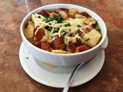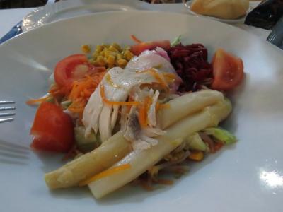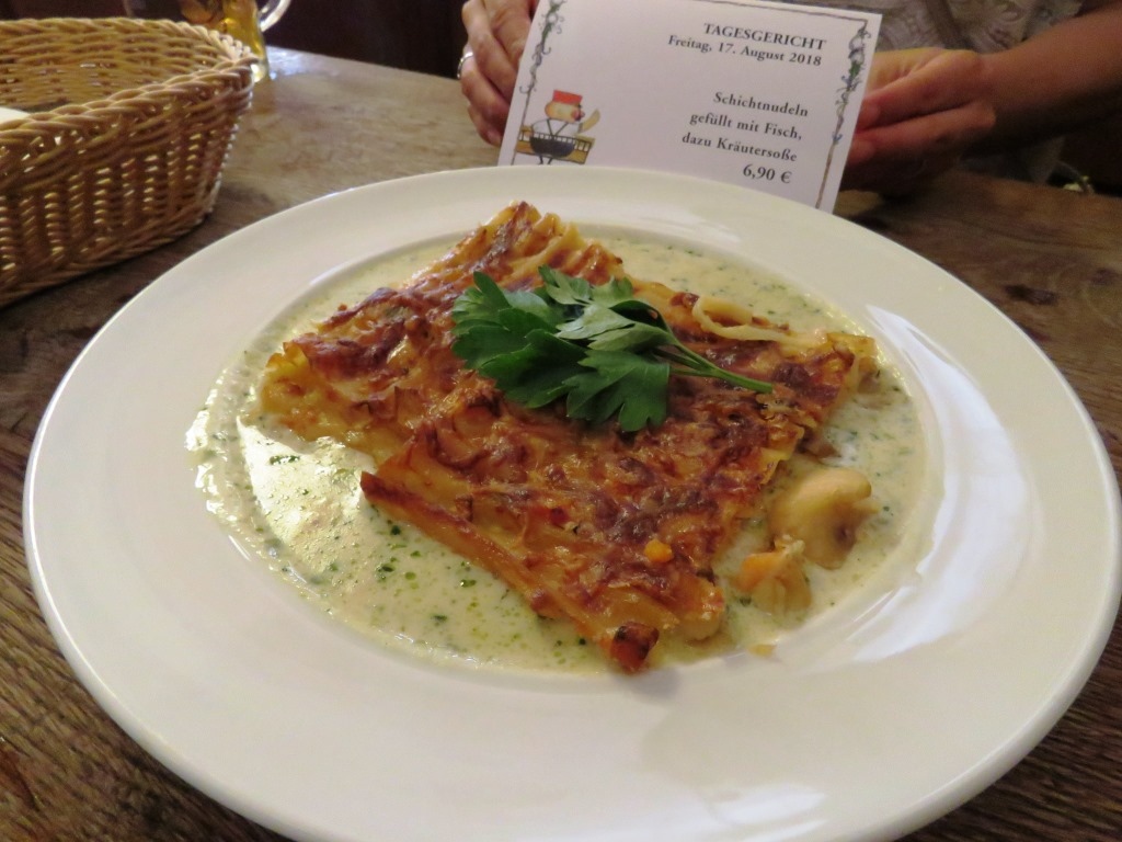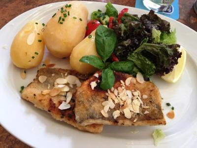 旧ガルミッシュ地区のレストランです(ちょっと場所が分かりにくいかも)。某口コミサイトでも高評価でしたのでディナーで訪れました。予約なしで行くと、すでに沢山の客で賑わってましたが、テラス席が2~3テーブルまだ空いていたので着席。ビール、パンケーキスープ、シュヴァイネブラーテン、パイクパーチ(スズキ科の淡水魚)のフライをオーダー。シュヴァイネブラーテンは、豚肉を煮てグレービーソースで和え、クネーデル(茹でジャガ団子)が添えられたバイエルン地方の郷土料理ですが、素朴な味わいでビールにも合い大満足。雰囲気も良くカフェまでしっかり寛げました。