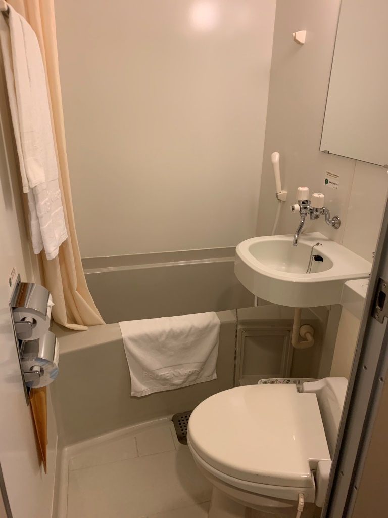 阪急および大阪モノレールの駅から徒歩2分の便利な立地です。駅前ですので店もいろいろあります。古い建物で研修センターのような客室ですが、大浴場(といっても小ぶり)があり出張の疲れを癒せます。コスパは充分かと思いました。
