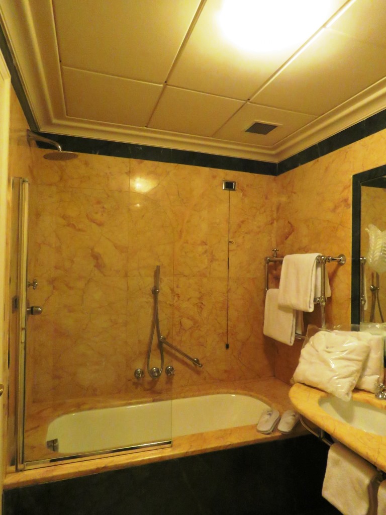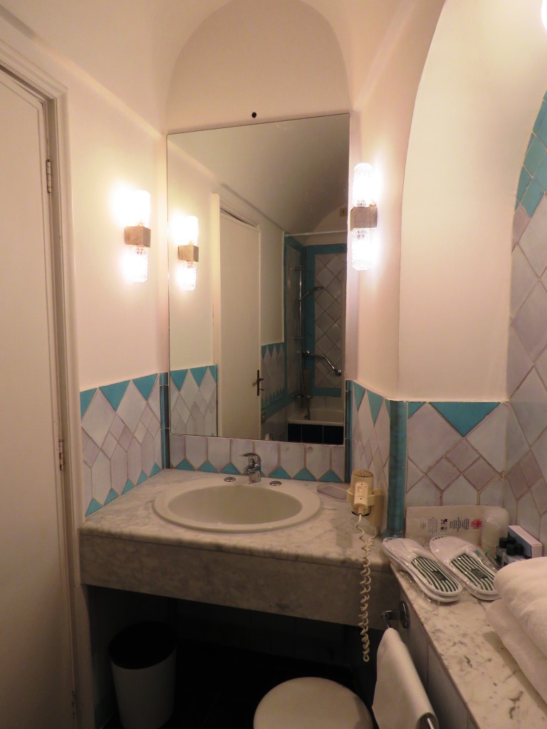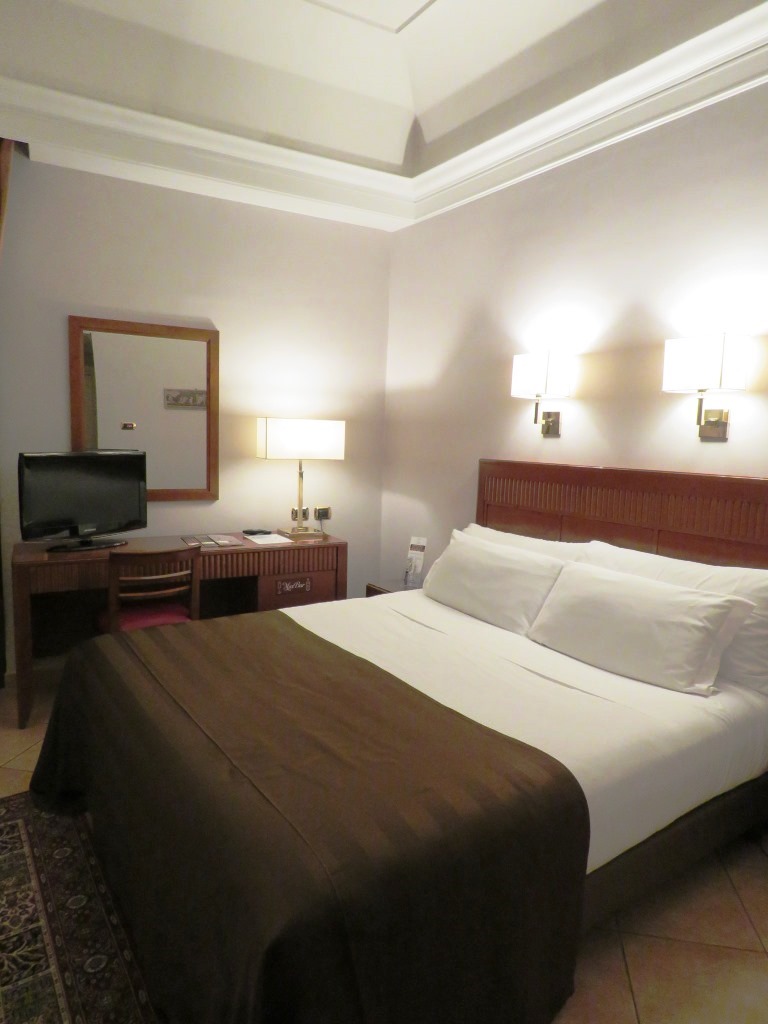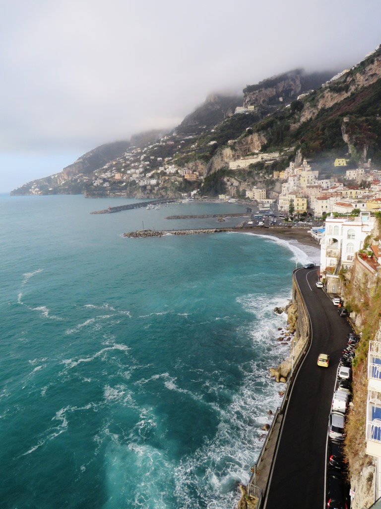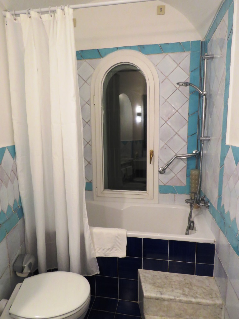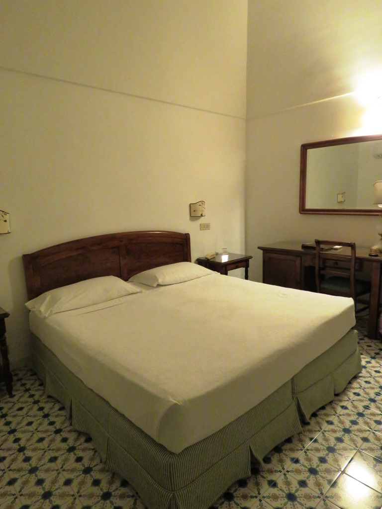アマルフィ市街の東の半島の先端に建つ、中世の修道院を改装した歴史あるホテルです。元は修道院なので、建物の基本構造は修道院に準じたシンプルさがあり、かつアンティークです。もちろん、充分快適に過ごせるようにリノベートされており、全室シービューとのことで、部屋からは海と市街の眺望が広がっていました。多くの著名人が宿泊してきたようで、そうした歴史あるホテルの割には料金も手頃です。中心街も徒歩圏でおススメです。