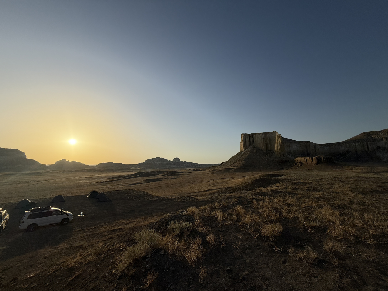 キャンプ地の見渡す限り360度絶景。恐竜の時代にタイムスリップしたか、別の星に来てしまったかのような風景。その中で日が沈みオレンジ色のサンセット。絶対おすすめです。