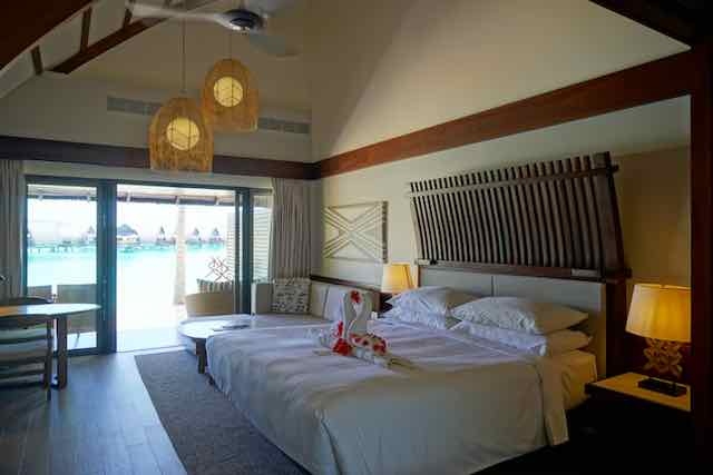 3泊で利用しました。広大な敷地のラグーン側と外海側にビラが並びラグーン内には水上ビラがあるリゾートです。レストランが3件あり、基本はビュッフェレストランで頂きました。景色は最高ですが味は普通です。シャワールームは広めですが水圧は弱めでした。スタッフの対応は皆さんフレンドリーで親切でしたがクリーニングスタッフの対応が最悪で頼んでも清掃が遅れたり来ても10分足らずで帰ってしまい補充内容が欠品だらけでした。多分、一部の個人のやる気のない方がいるだけとは思いますがホテル全体の印象が悪く感じてしまいます。それを除けば良いリゾートでした。