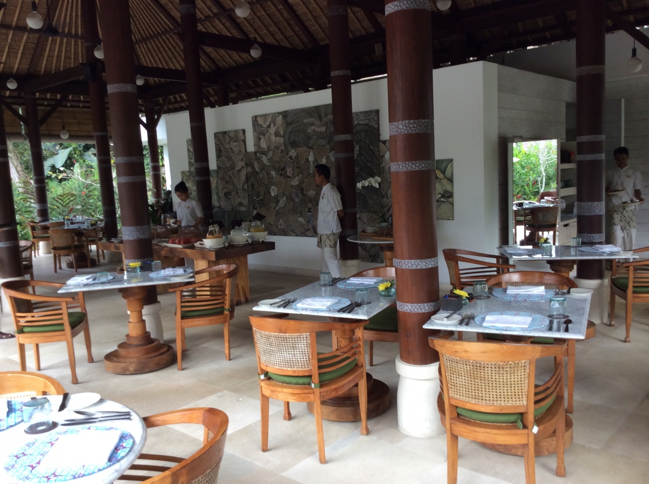 - 日本語を話せるスタッフもいるし、オーナーらしき方がテーブル毎に挨拶してくる。ライスフィールドが見える席と意思表示をすると、案内してくれる。