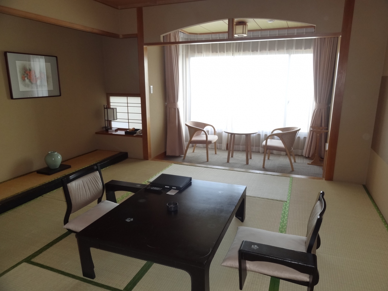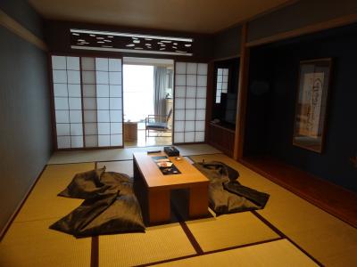 部屋は和室にテーブル・椅子を備えた広縁、バルコニーが付いており広い。窓の外に広がる青い海、開放的でとてもくつろげるお部屋でした。